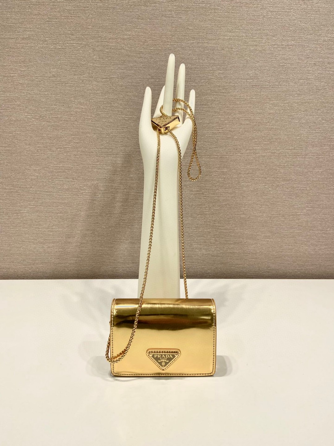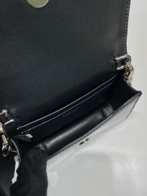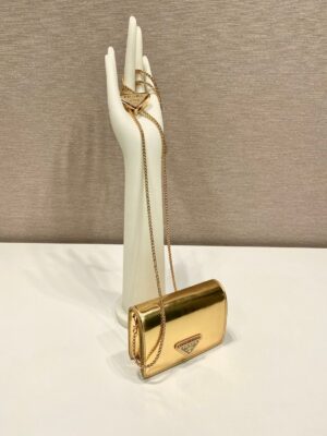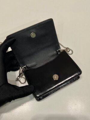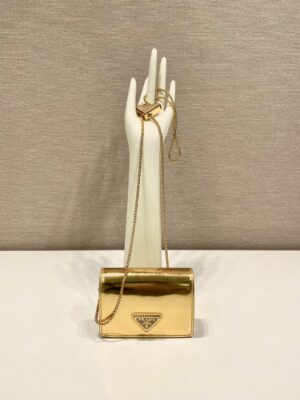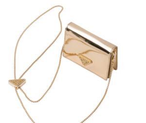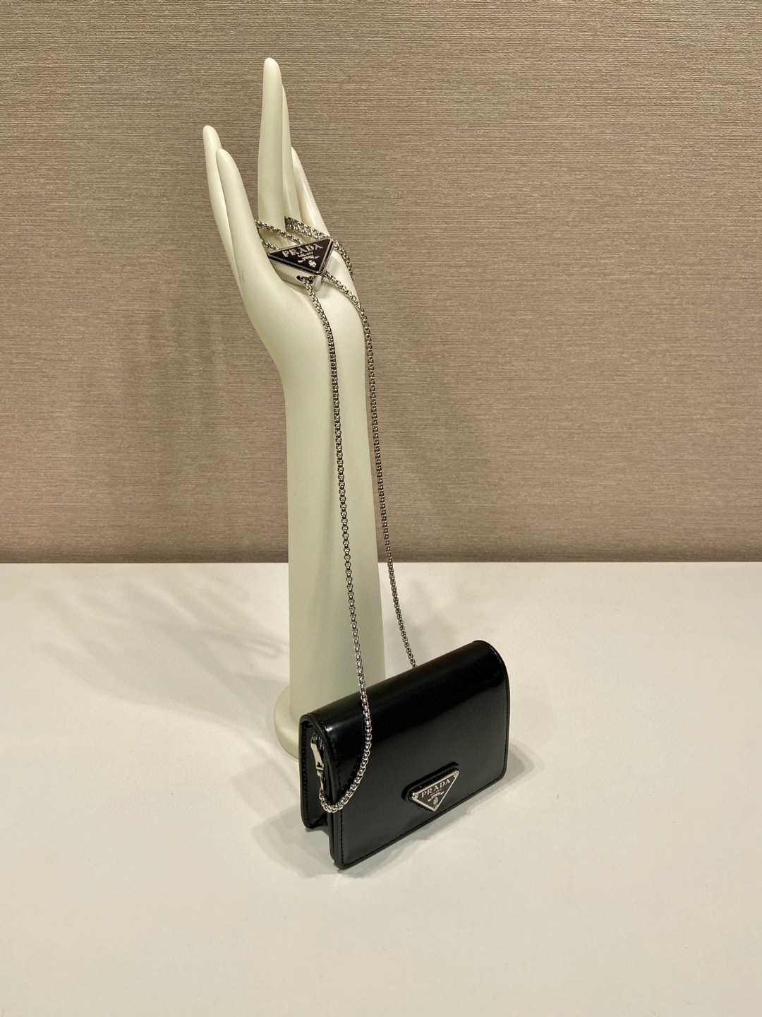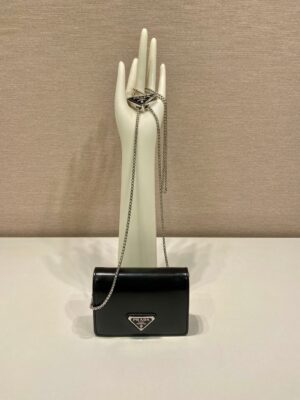 Brushed Card Holder With Shoulder Strap with a sophisticated yet versatile design, this brushed card holder plays with Prada’s triangle logo, which is the star of the accessory. The detachable chain shoulder strap allows it to be worn in different ways.