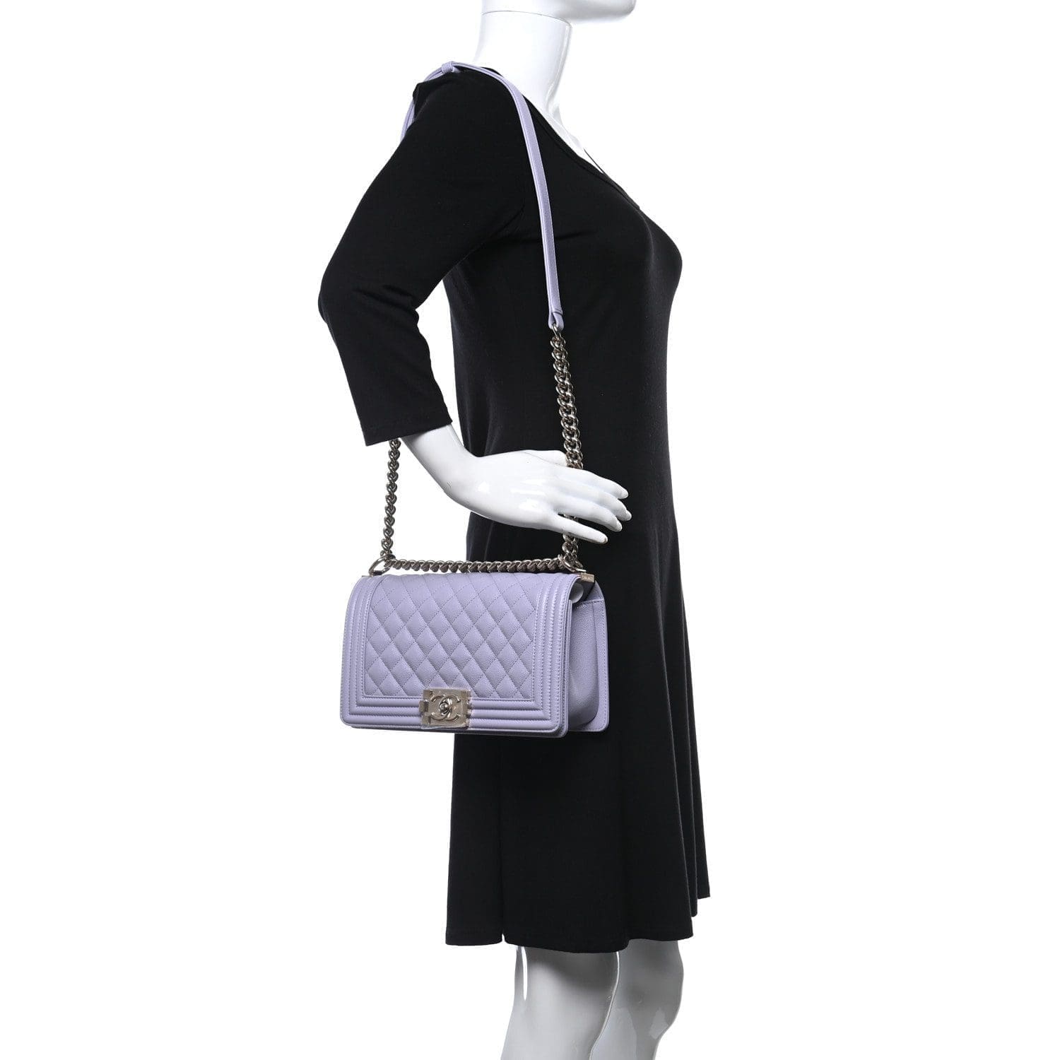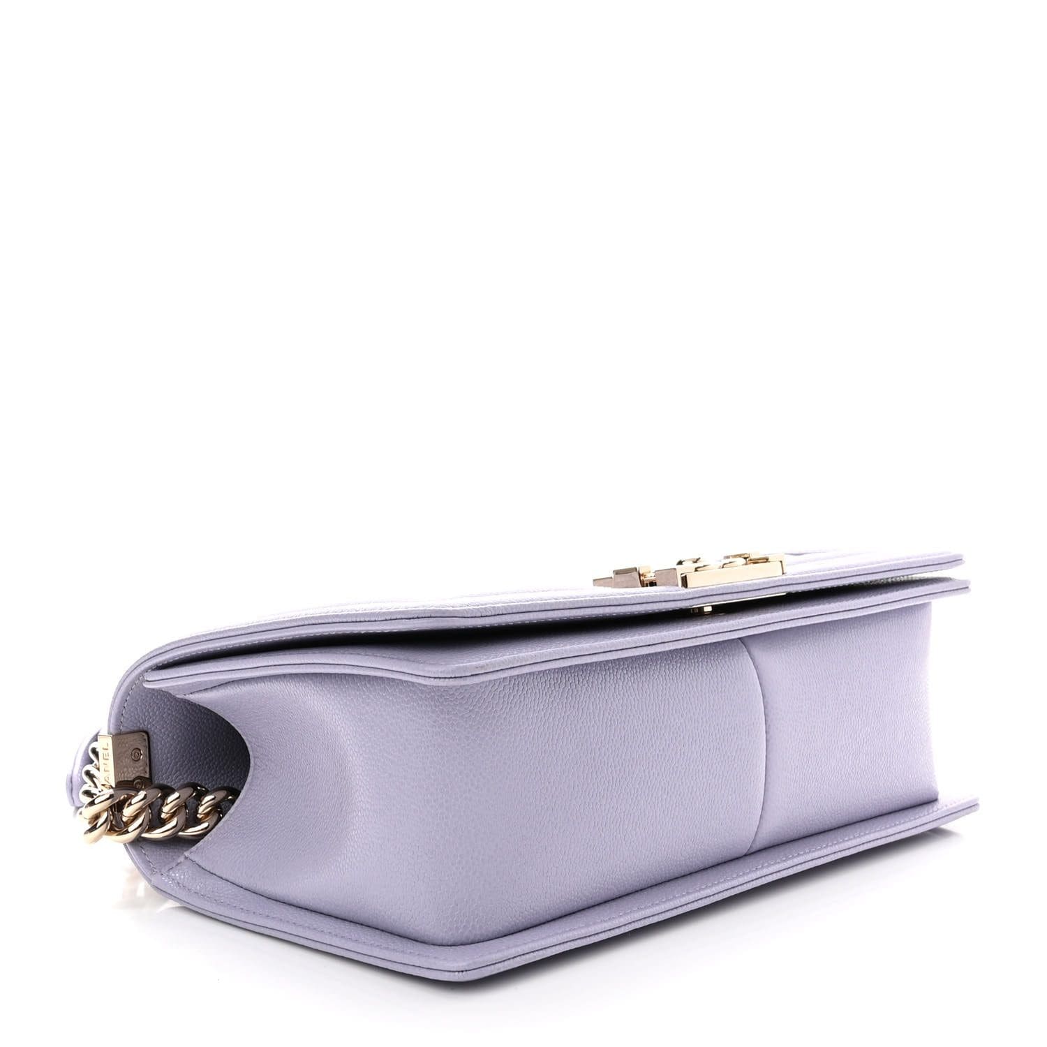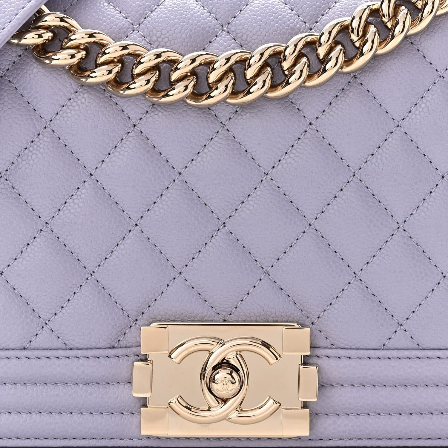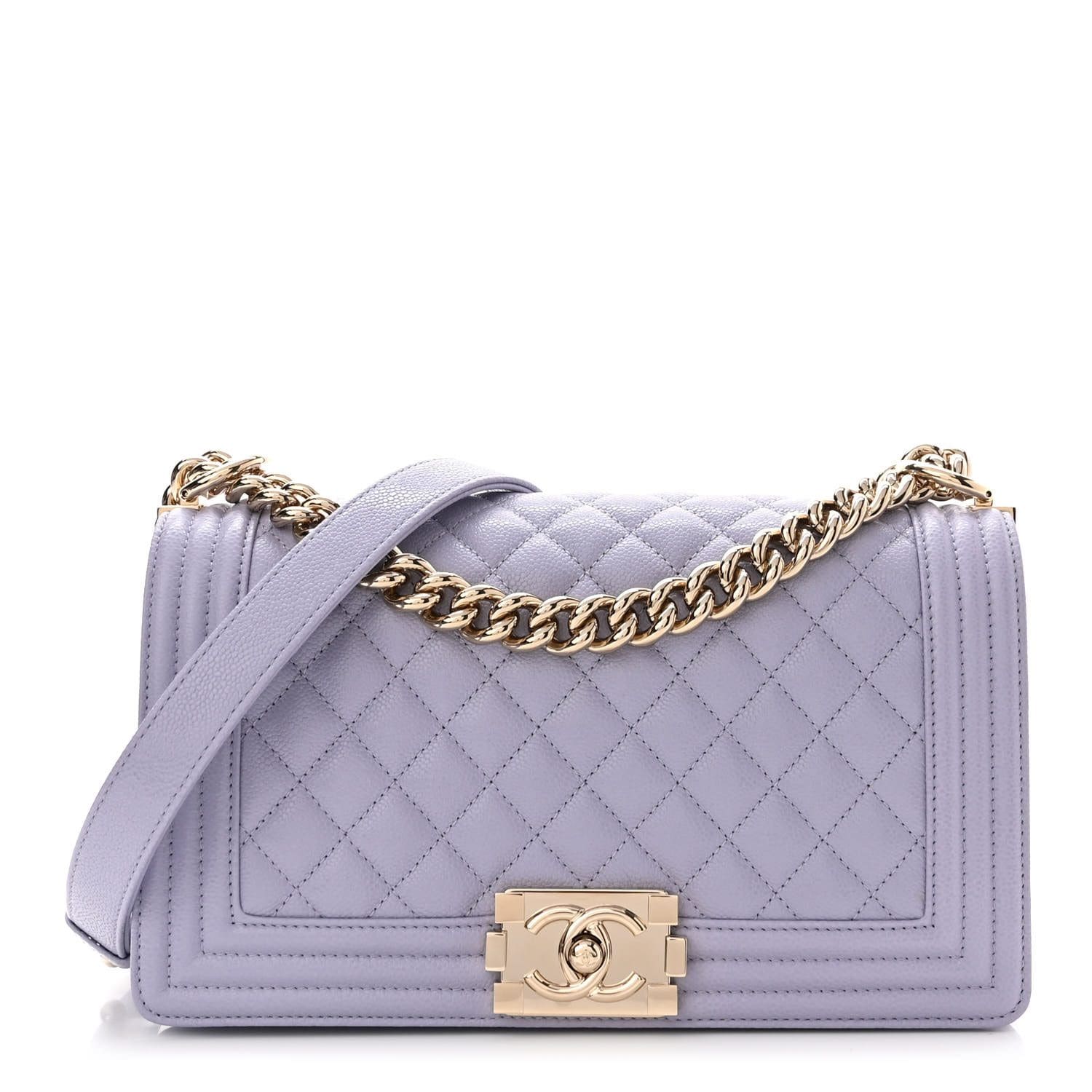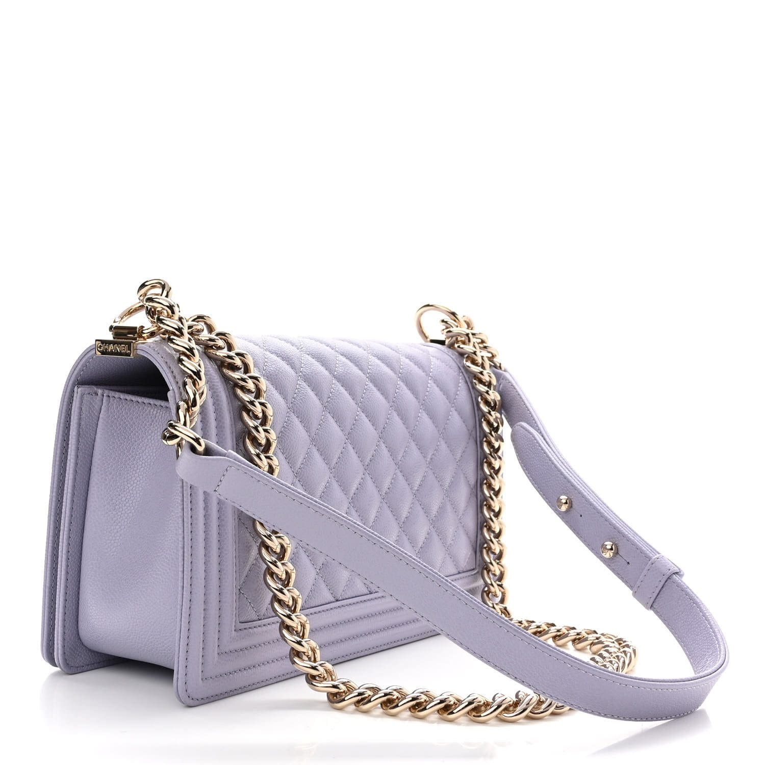 This is an authentic CHANEL Caviar Quilted Medium Boy Flap in Light Purple. This stylish shoulder bag is crafted of luxurious diamond quilted caviar leather in light purple framed by linear quilting. It features a gold chain link shoulder strap with a leather shoulder pad and a push lock. This opens to a matching fabric interior with a patch pocket.