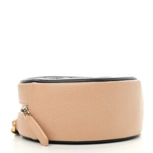 This is an authentic CHANEL Caviar Quilted Round Filigree Crossbody in Beige and Black. This stylish shoulder bag is crafted of luxurious caviar leather in beige with smooth black leather trim. The bag features a brass chain link leather threaded shoulder strap and brass tips on the quilted Chanel CC logo. This shoulder bag opens a top zipper to a black fabric interior with a patch pocket.
