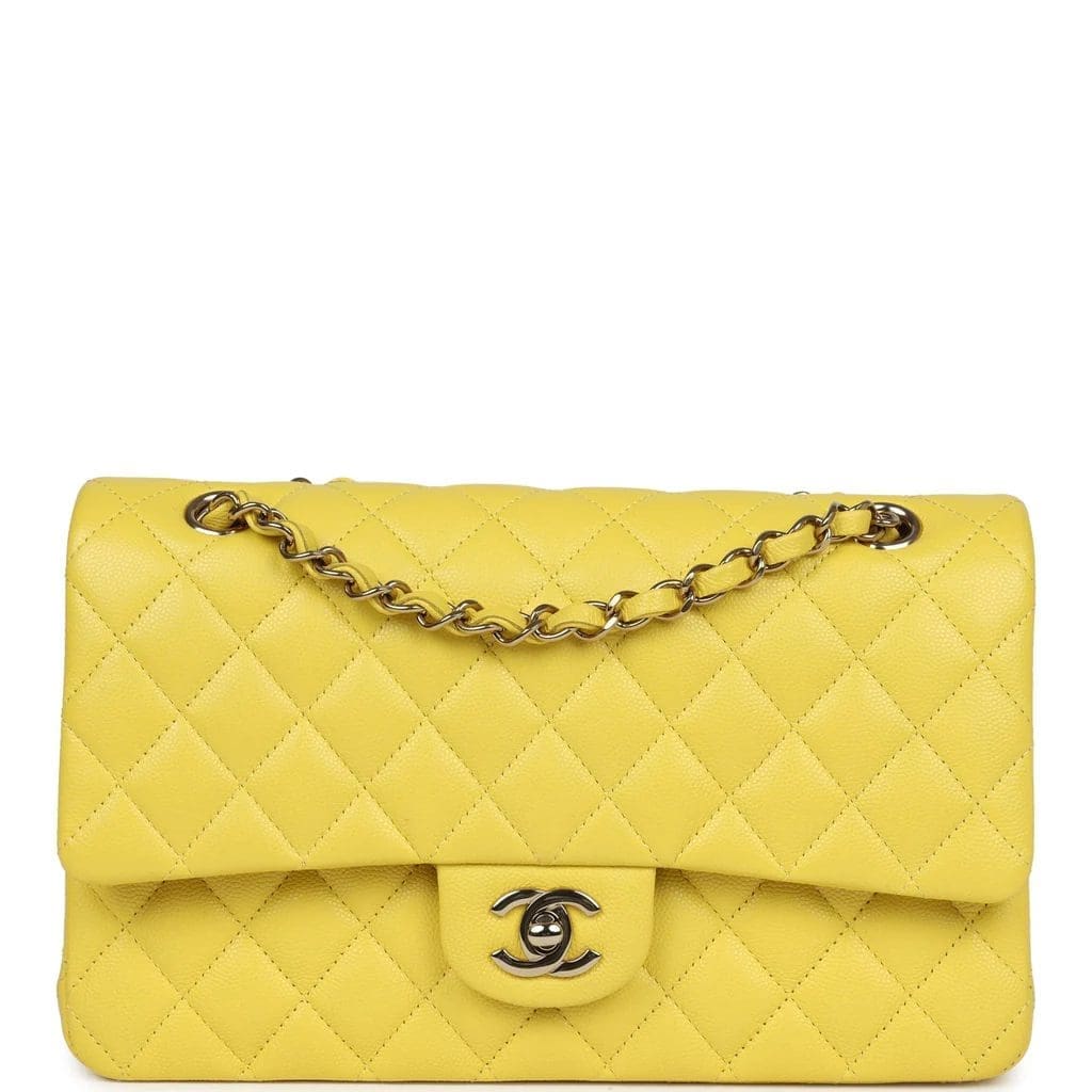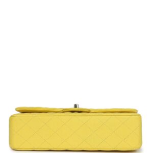 This Chanel medium classic double flap bag is in yellow caviar leather with light gold tone hardware and features a front flap with signature CC turnlock closure, half moon back pocket, and adjustable interwoven light gold tone chain link and yellow leather shoulder strap.