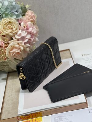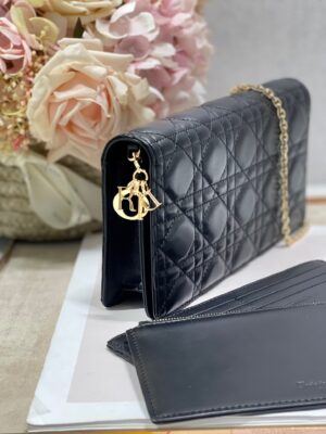 The Lady Dior pouchis distinguished by the emblematic Cannage topstitching and a detachable ‘D.I.O.R.’ charm. This unique accessory may be worn with or without its chain strap and features two removable elements: a card holder and a zipped pouch. Each may be carried individually. The pouch will instantly stand out and pairs well with other pieces from the same line.