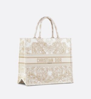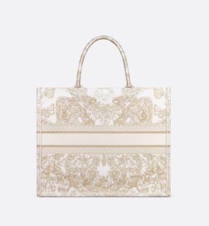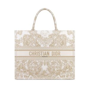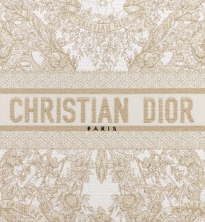 Introduced by Maria Grazia Chiuri, Creative Director of Christian Dior, the Dior Book Tote has become a staple of the Dior aesthetic. Designed to hold all the daily essentials, it is fully embroidered with a gold-tone and white Butterfly Around The World motif, showcasing the collection’s signature butterfly embellished with the words L’envol des papillons dévoile nos désirs aux étoiles. Adorned with the Christian Dior Paris signature on the front, the large tote exemplifies the House’s signature savoir-faire and may be carried by hand or worn over the shoulder.