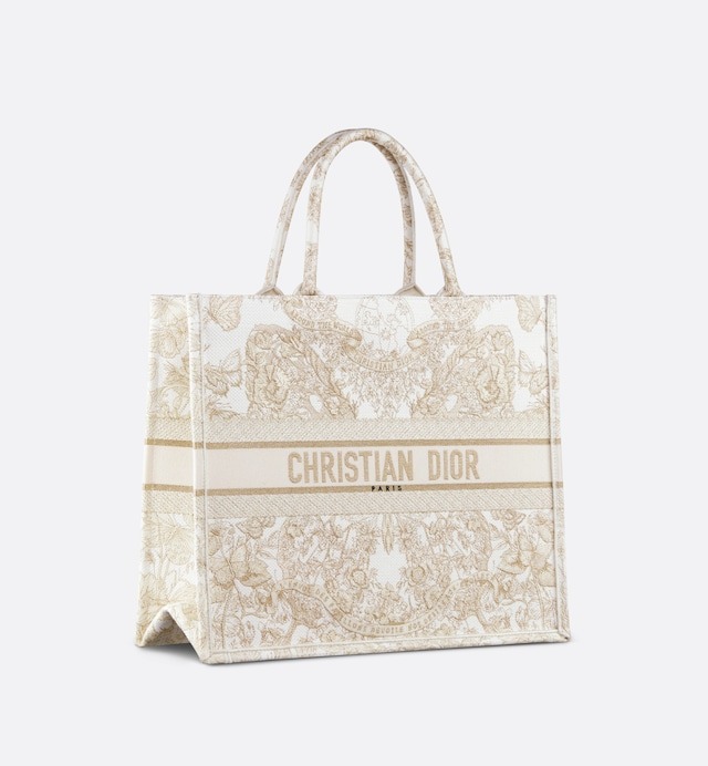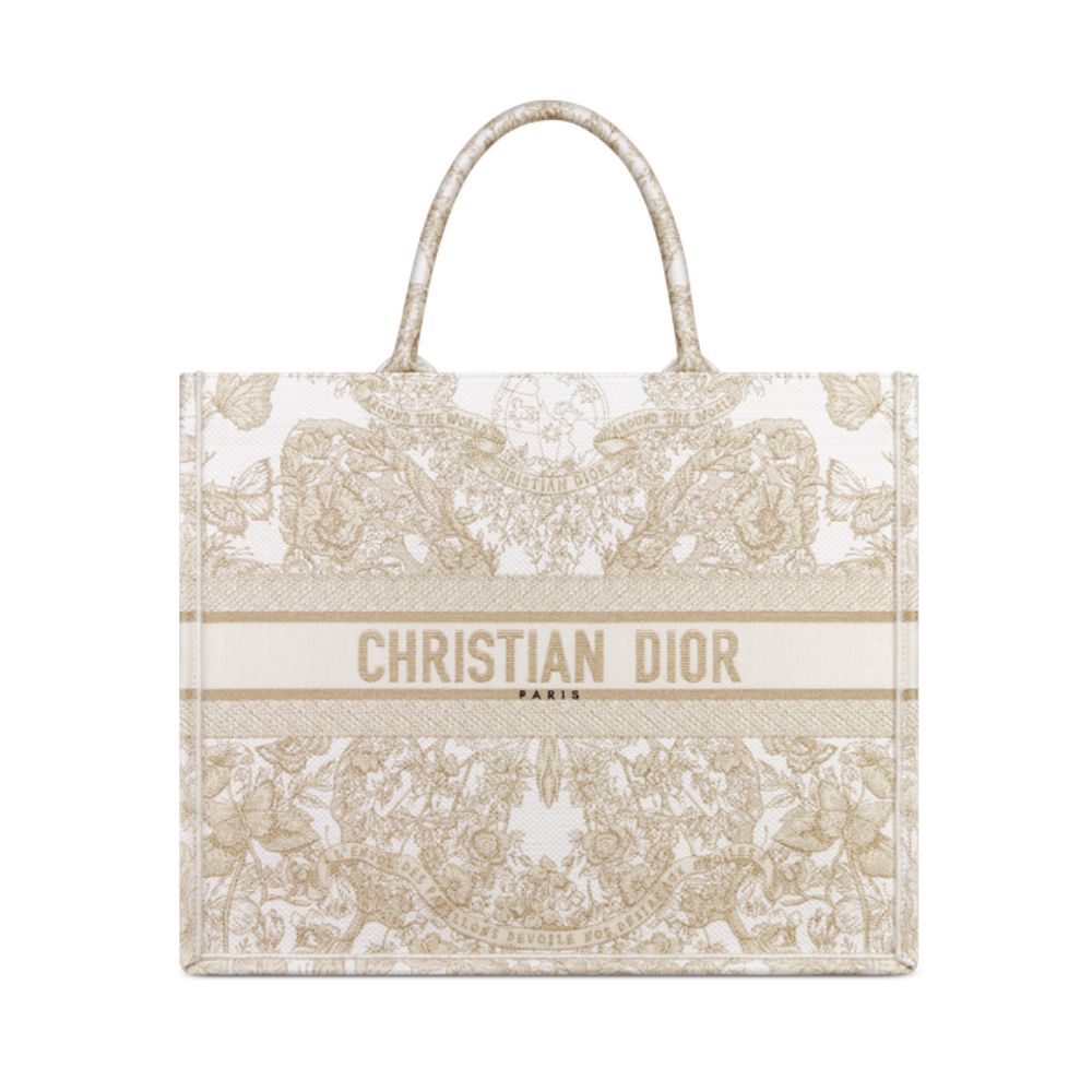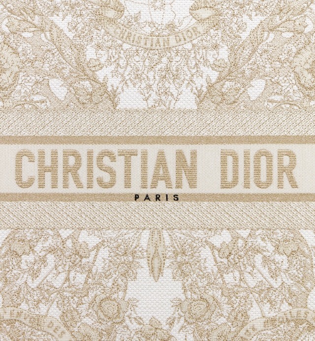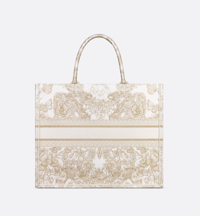 Introduced by Maria Grazia Chiuri, Creative Director of Christian Dior, the Dior Book Tote has become a staple of the Dior aesthetic. Designed to hold all the daily essentials, it is fully embroidered with a gold-tone and white Butterfly Around The World motif, showcasing the collection’s signature butterfly embellished with the words L’envol des papillons dévoile nos désirs aux étoiles. Adorned with the Christian Dior Paris signature on the front, the large tote exemplifies the House’s signature savoir-faire and may be carried by hand or worn over the shoulder.