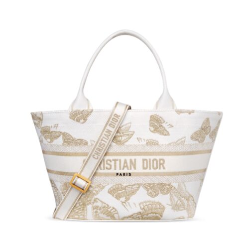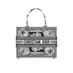 Introduced by Maria Grazia Chiuri, Creative Director of Christian Dior, the Dior Book Tote has become a staple of the Dior aesthetic. Designed to hold all the daily essentials, the style is fully embroidered with a black and white Butterfly Bandana motif, combining the butterfly with the timeless bandana pattern in a graphic spirit. Adorned with the Christian Dior Paris signature on the front, the medium tote exemplifies the House’s signature savoir-faire and may be carried by hand or worn over the shoulder.