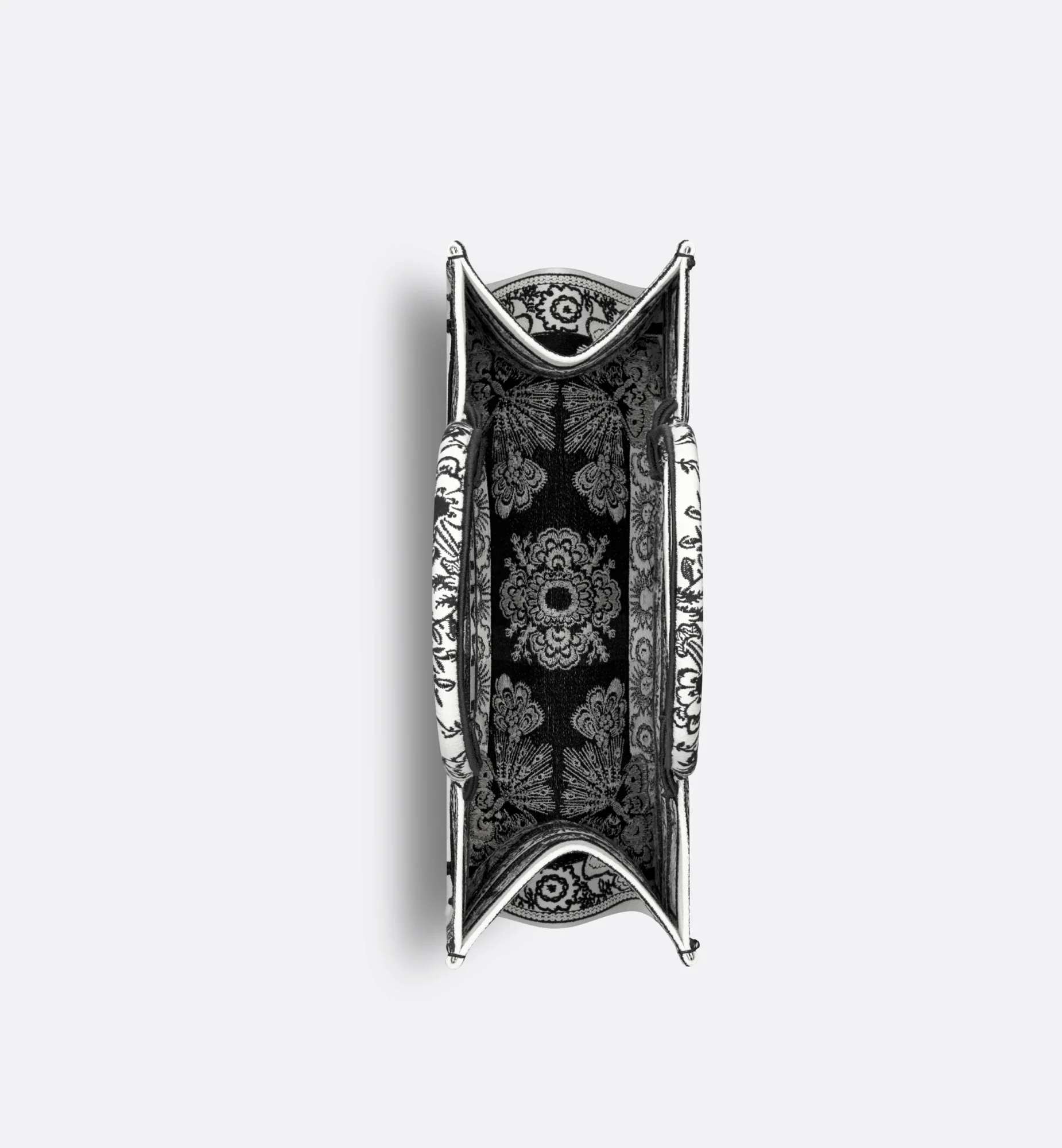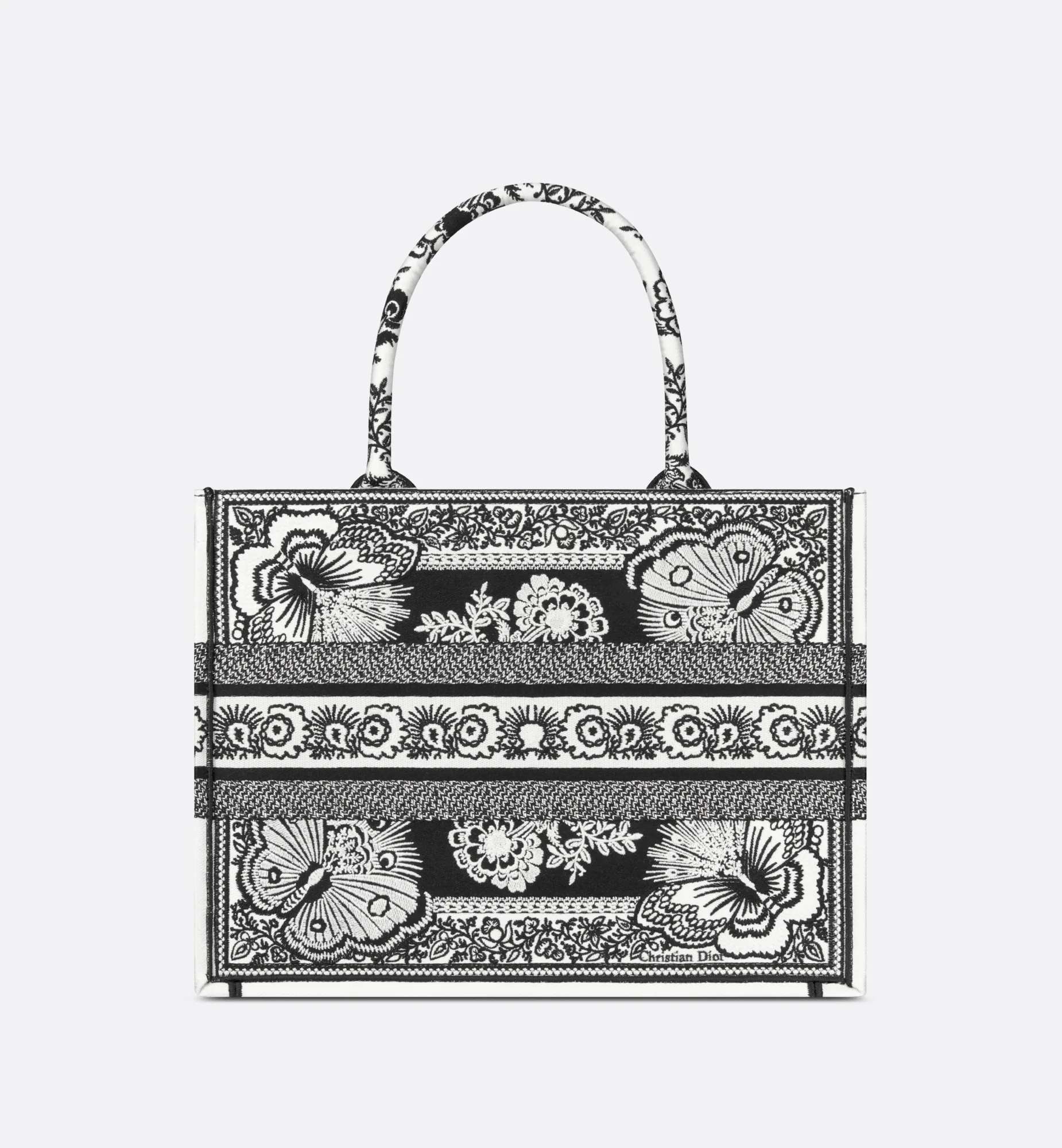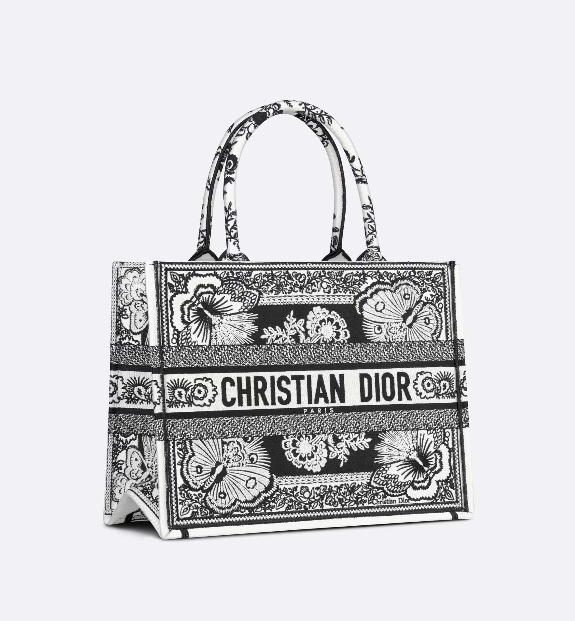 Introduced by Maria Grazia Chiuri, Creative Director of Christian Dior, the Dior Book Tote has become a staple of the Dior aesthetic. Designed to hold all the daily essentials, the style is fully embroidered with a black and white Butterfly Bandana motif, combining the butterfly with the timeless bandana pattern in a graphic spirit. Adorned with the Christian Dior Paris signature on the front, the medium tote exemplifies the House’s signature savoir-faire and may be carried by hand or worn over the shoulder.