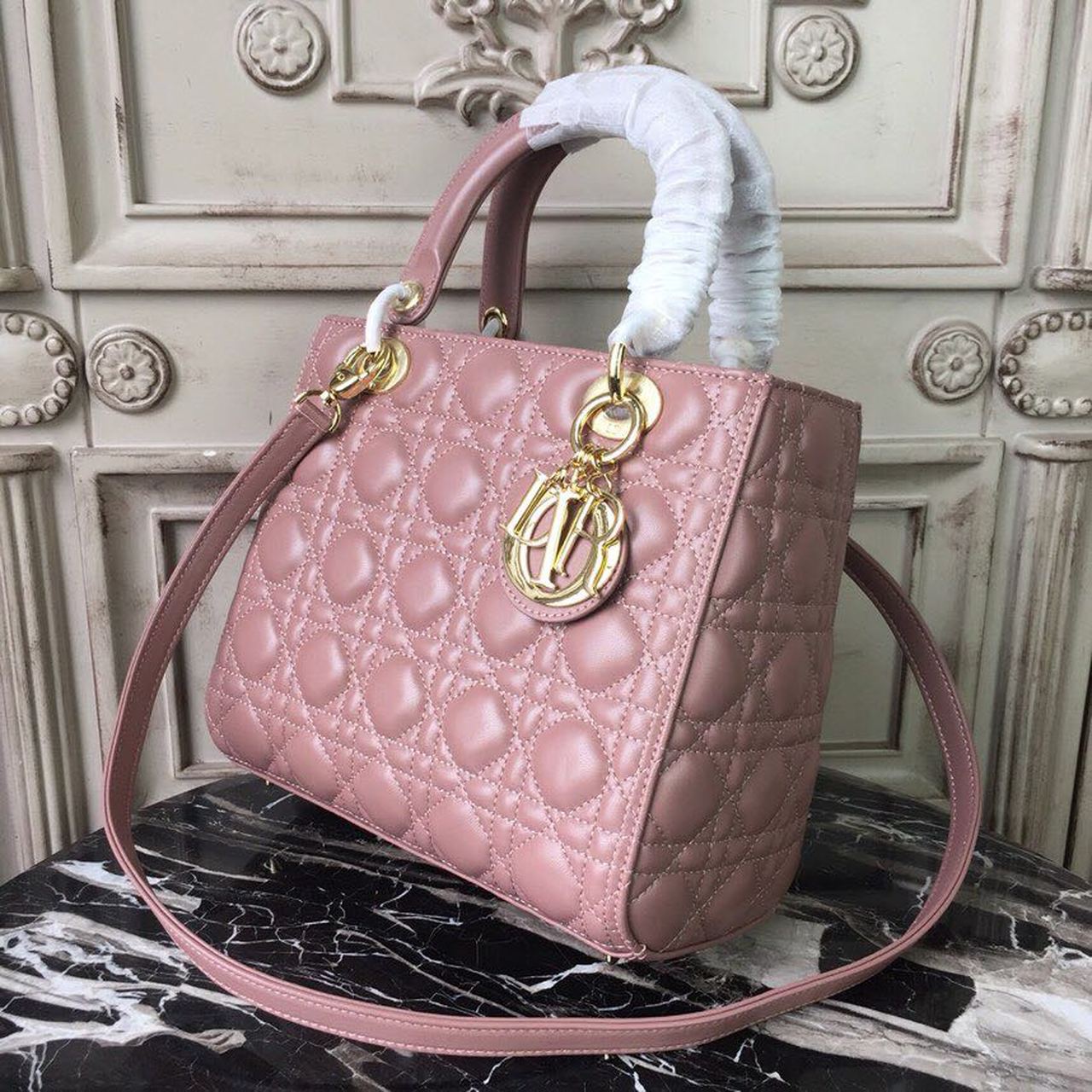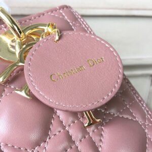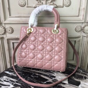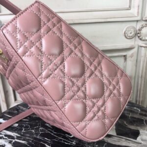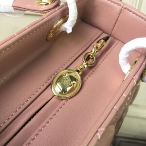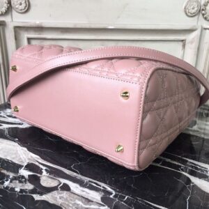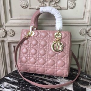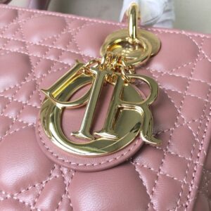 The Lady Dior bag epitomizes the House’s vision of elegance and beauty. Sleek and refined, the timeless style is crafted in blush with Cannage stitching, creating the instantly recognizable quilted texture, while the pale gold-finish metal ‘D.I.O.R.’ charms offer an elegant allure. Featuring a thin, removable shoulder strap, the medium style may be carried by hand or worn crossbody.