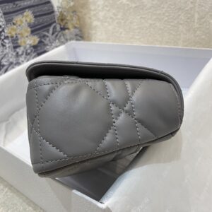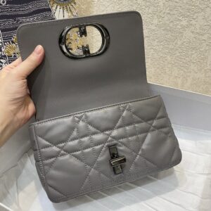 The Dior Caro bag combines modernity with timeless elegance. The design is crafted in Gray supple with Cannage stitching. The bag features a flap adorned with an antique metal ‘CD’ twist clasp, inspired by the seal of a Christian Dior perfume bottle. The detachable chain shoulder strap with ‘CD’ signature links allows it to be carried by hand, over the shoulder or crossbody, or replaced by one of the House’s wide embroidered straps, allowing the large bag to pair with day or evening attire.