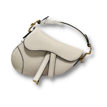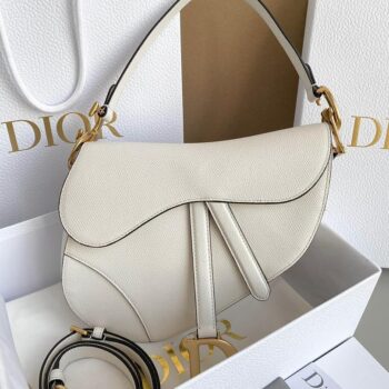 The iconic Saddle bag, crafted in white , is reimagined by Maria Grazia Chiuri. The legendary design is embellished with a Dior Oblique perforations motif and features a Saddle flap with a magnetic ‘D’ stirrup clasp and an antique gold-finish metal ‘CD’ signature on either side of the strap. The bag has a wide embroidered strap, both adjustable and removable, and may be carried by hand, worn over the shoulder or crossbody.