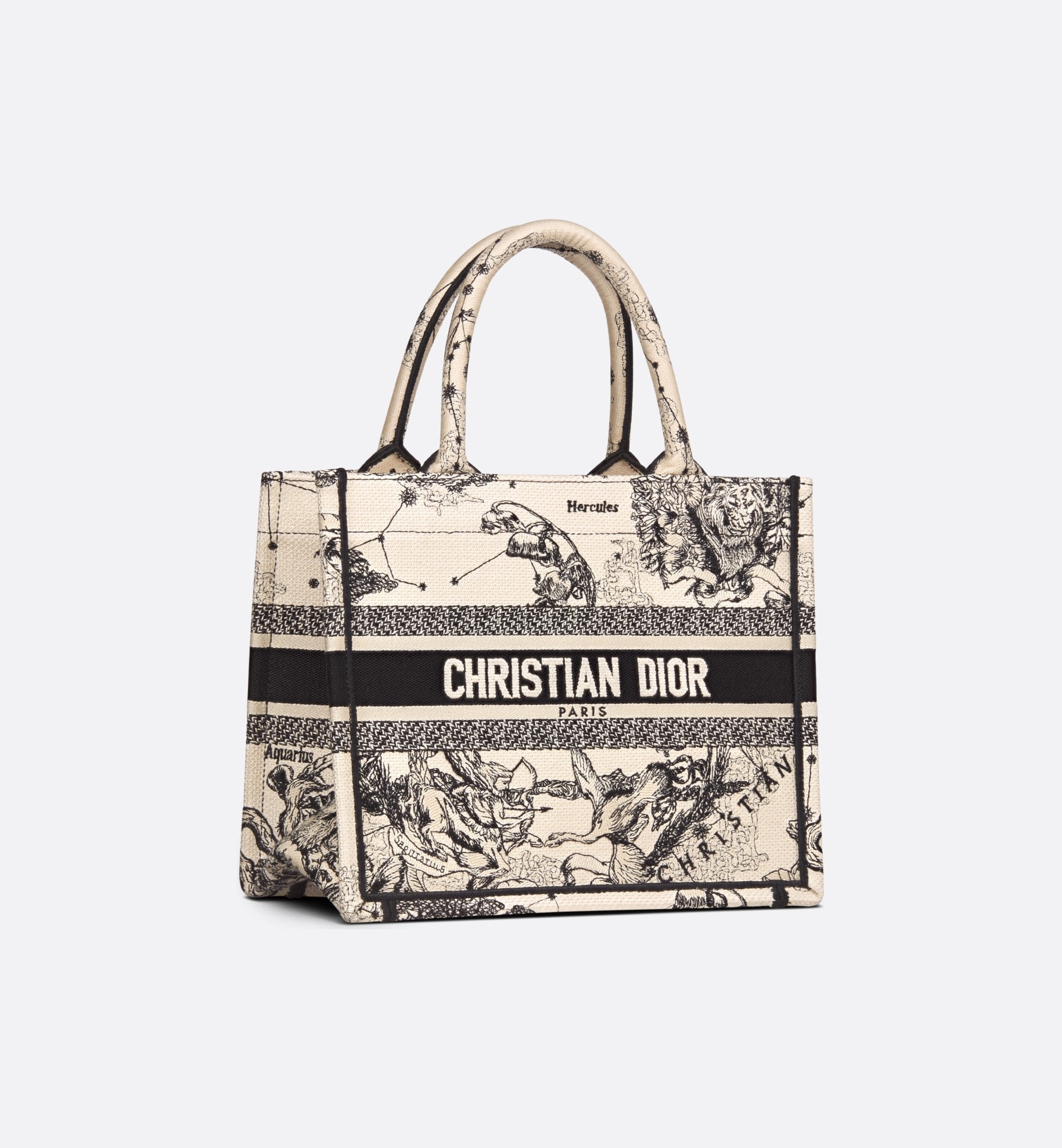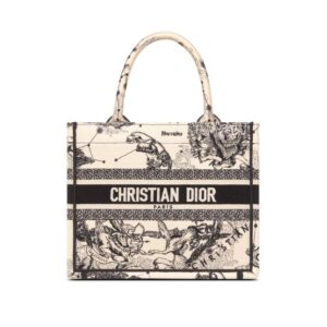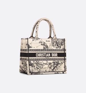 Introduced by Maria Grazia Chiuri, Creative Director of Christian Dior, the Dior Book Tote has become a staple of the Dior aesthetic. Designed to hold all the daily essentials, the latte and black style is fully embroidered with the Toile de Jouy Zodiac motif, a variation of the iconic pattern that incorporates Mr. Dior’s passion for astrology. Adorned with the Christian Dior Paris signature on the front, the small tote exemplifies the House’s signature savoir-faire and may be carried by hand.