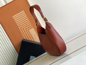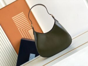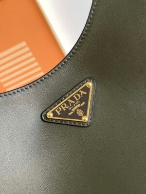 The Prada Cleo Brushed Shoulder Bag with sophisticated allure reinterprets an iconic design of the brand from the nineties. The sleek, curved lines emphasized by the particular sloped construction of the bottom and sides give this hobo bag a soft, light look. A distinctive element of Prada collections, is a modern and versatile material that lends itself to always new combinations and contrasts. The triangle logo decorates the silhouette.