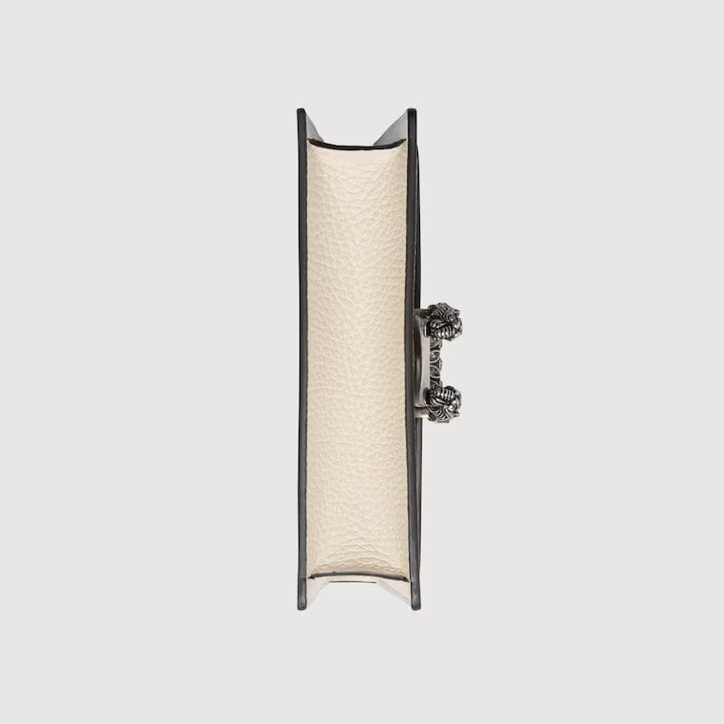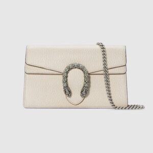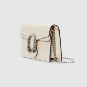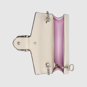 Made in resistant textured leather, the structured Dionysus super mini bag is completed with a tiger head spur closure, enriched with Swarovski crystal stones. Equipped with a key ring that can be used to attach this bag to a separate larger bag.