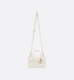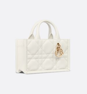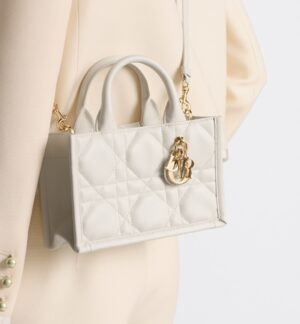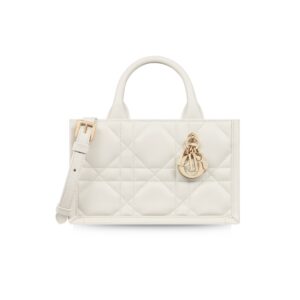 • The Dior Book Tote is a House classic and original design by Maria Grazia Chiuri, Creative Director of Christian Dior. Constructed in trench beige calfskin, it is embellished with hallmark Macrocannage topstitching and accented by pale gold-finish metal D.I.O.R. charms adorning one of the top handles. Exemplifying House savoir-faire, the miniature style features an adjustable and removable strap that allows it to be carried by hand, worn over the shoulder or crossbody.