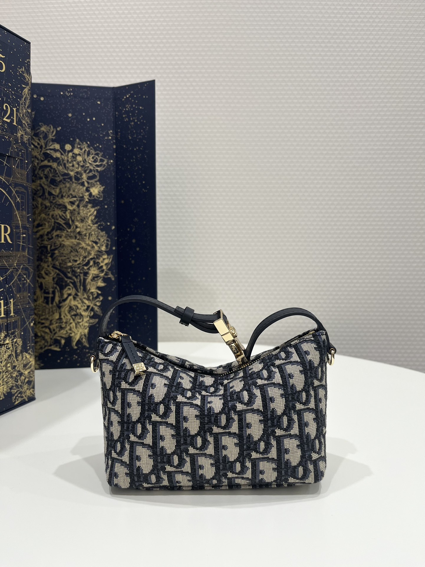 The Diortravel Nomad pouch is a modern hybrid design. Crafted in blue Dior Oblique jacquard, it presents a spacious and flexible form that will accommodate all the essentials. The medium style can be carried by hand or worn over the shoulder thanks to the top handle, complete with a military-inspired CD buckle, while one of the House’s embroidered shoulder straps can be attached to the side rings.