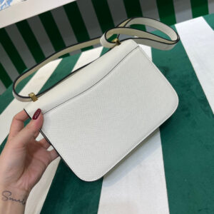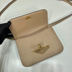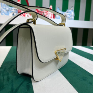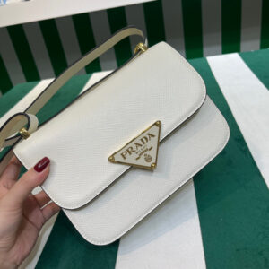 This shoulder bag with a structured, classic design is made of Saffiano , an iconic material of the brand distinguished by its crosshatch texture and waxed finish. The triangle logo, first introduced on trunks designed by Mario Prada, decorates the front. The accessory provided with a handle with an original design is completed by an adjustable shoulder strap for versatile wear.