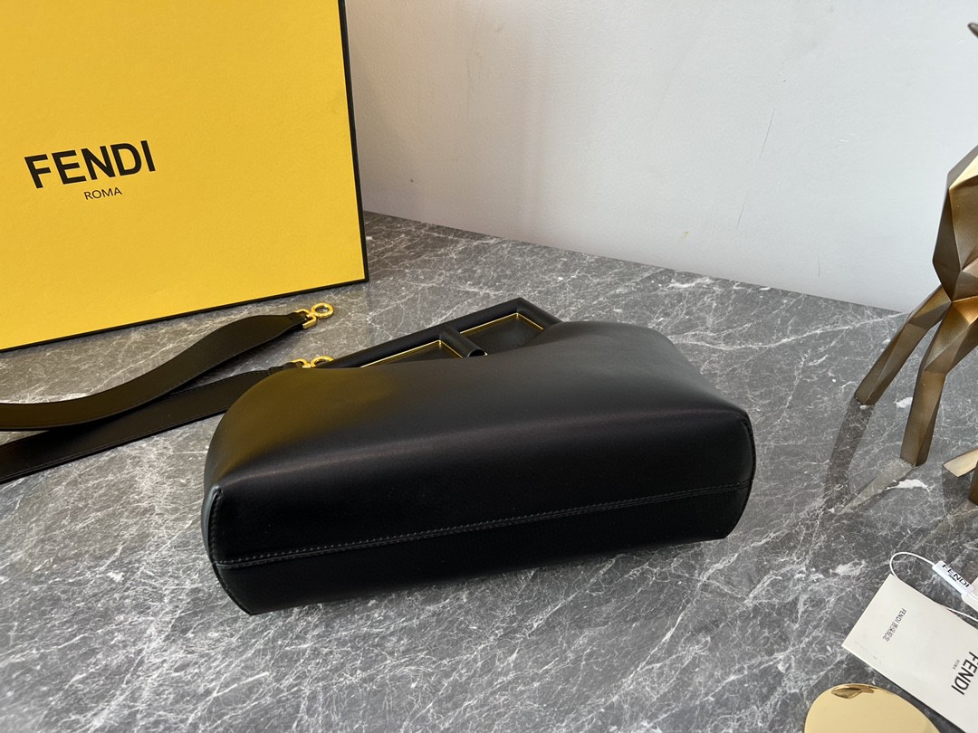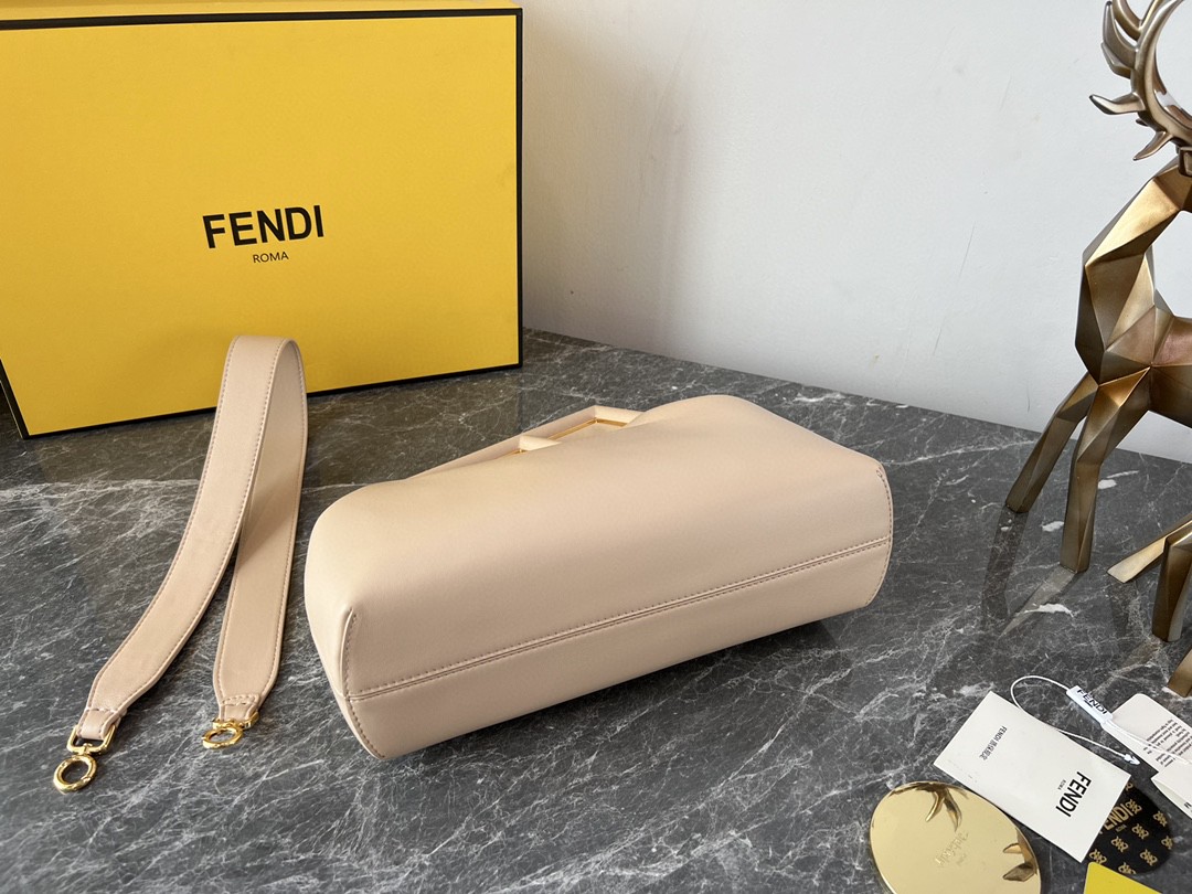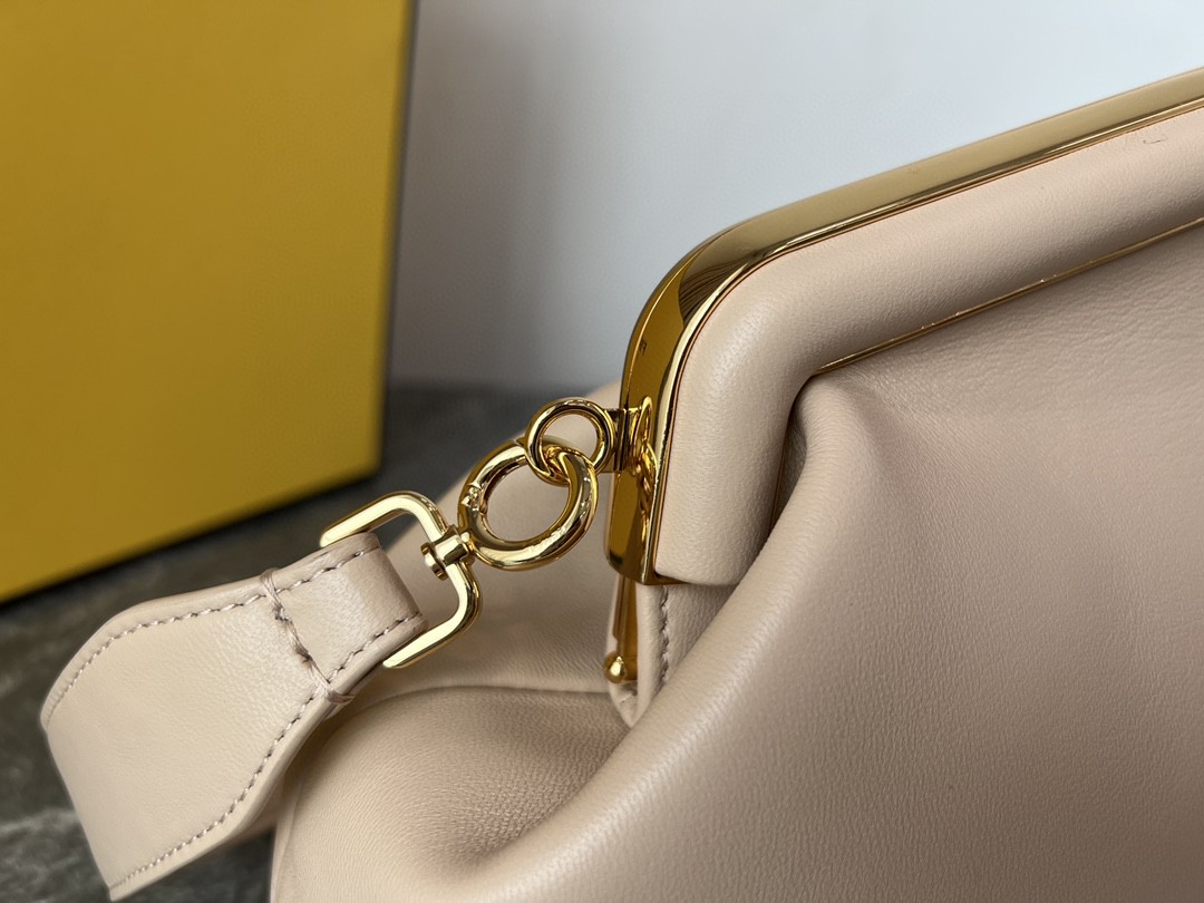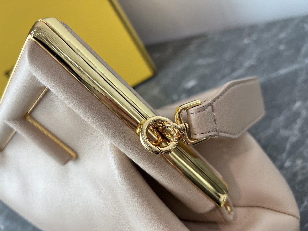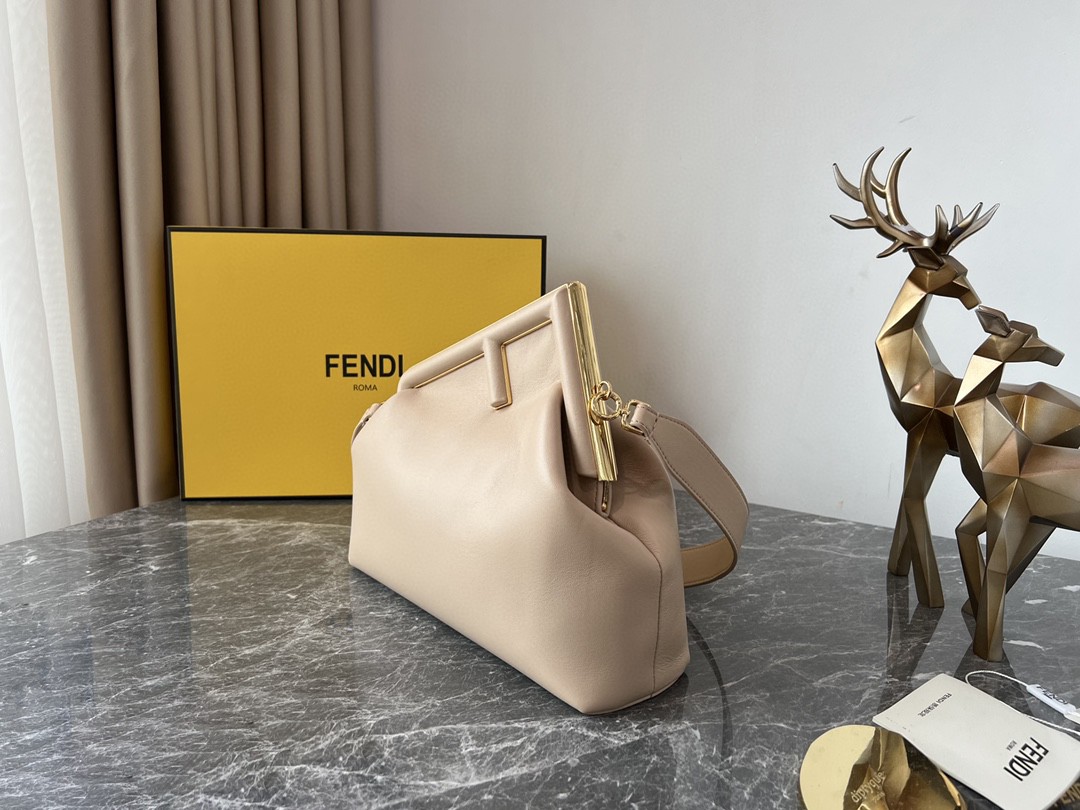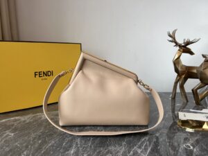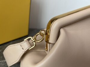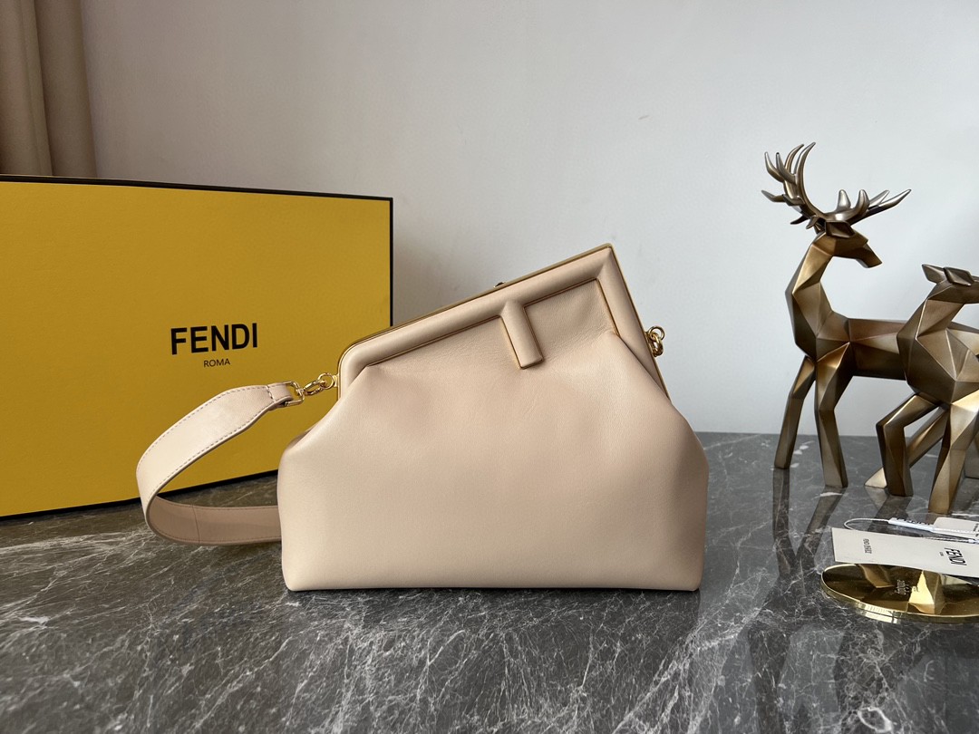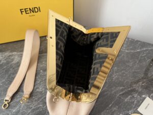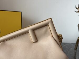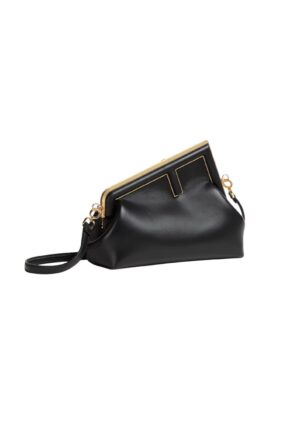 FD Midi First Bag is a made of soft, nappa with oversized metal F clasp with tone on tone nappa bands. Featuring an internal compartment lined in an iconic FF motif fabric, pull out internal attachment points and gold-finish metalware. Can be carried by hand as a clutch or worn on the shoulder thanks to the detachable shoulder strap.
