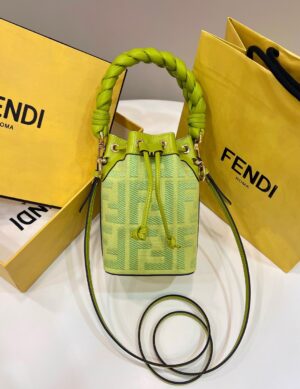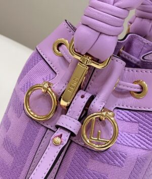 FD Small Mon Tresor Bucket Bag is made of canvas with a tone on tone raised embroidery FF motif and trimmed in tone on tone. Lined and with gold-finish metalware. Two detachable shoulder straps, one long and one short, in woven soft nappa , to wear the bag over the shoulder or cross-body.