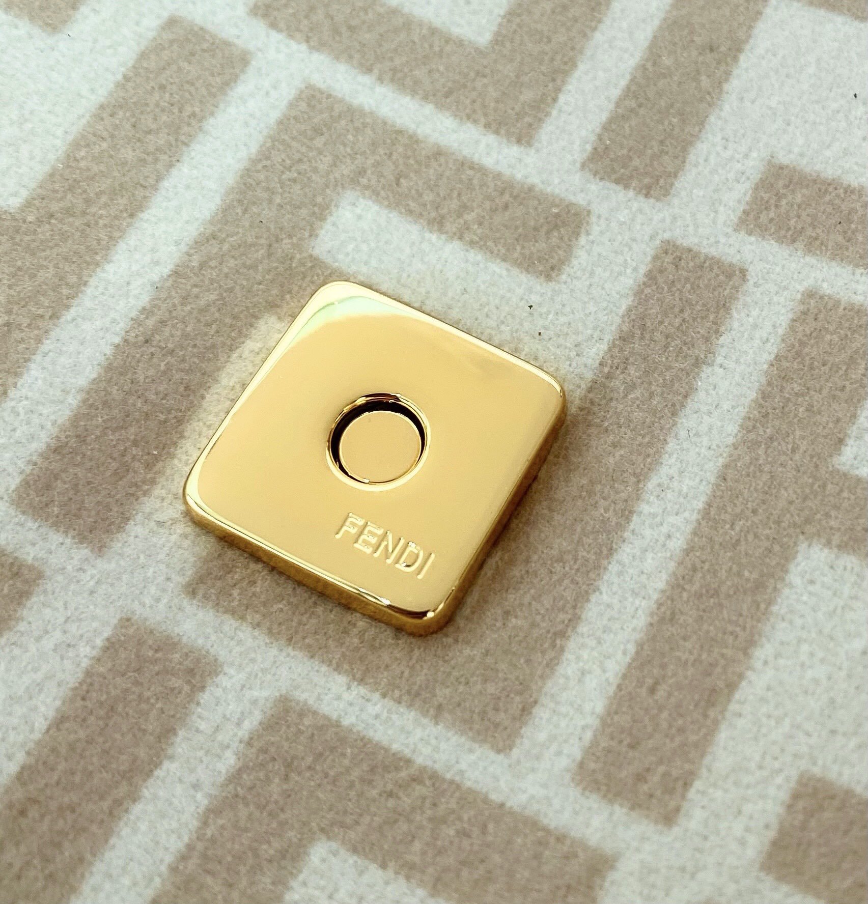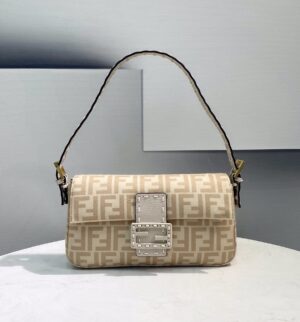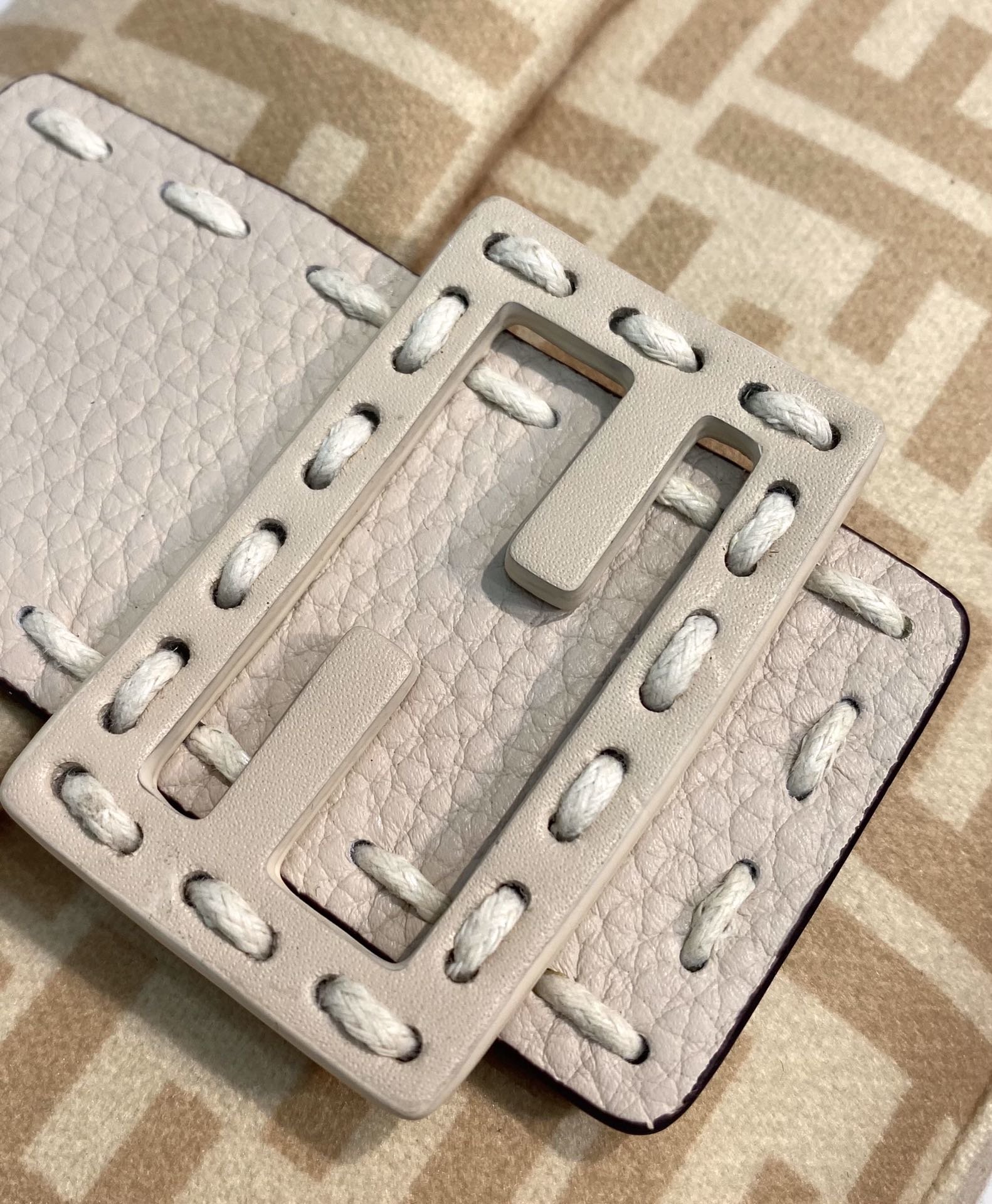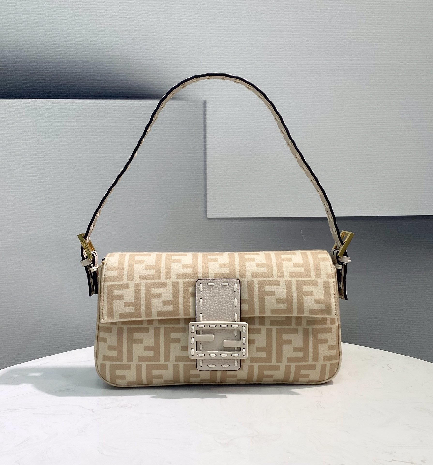 Medium Baguette 1997 bag made of wool with beige FF motif, embellished with an FF clasp. This style is a re-release of the first Fendi Baguette bag created in 1997, from which it takes its name and iconic ‘under the arm’ design. It can be carried on the shoulder or in the hand or as a pochette thanks to the folding, detachable handle.