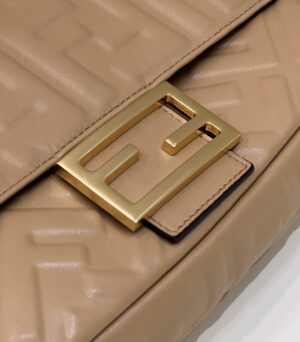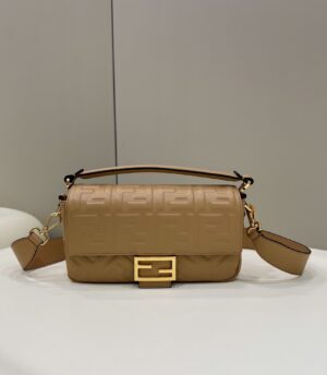 Iconic medium Baguette bag made of light brown soft nappa with a three-dimensional texture FF motif. The bag can be carried by hand, or worn either on the shoulder or cross-body thanks to the handle and shoulder strap, both detachable.