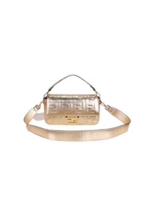 Iconic medium Baguette bag with chain, made of soft, gold nappa leather with a 3D texture FF motif. Decorated with an FF clasp.