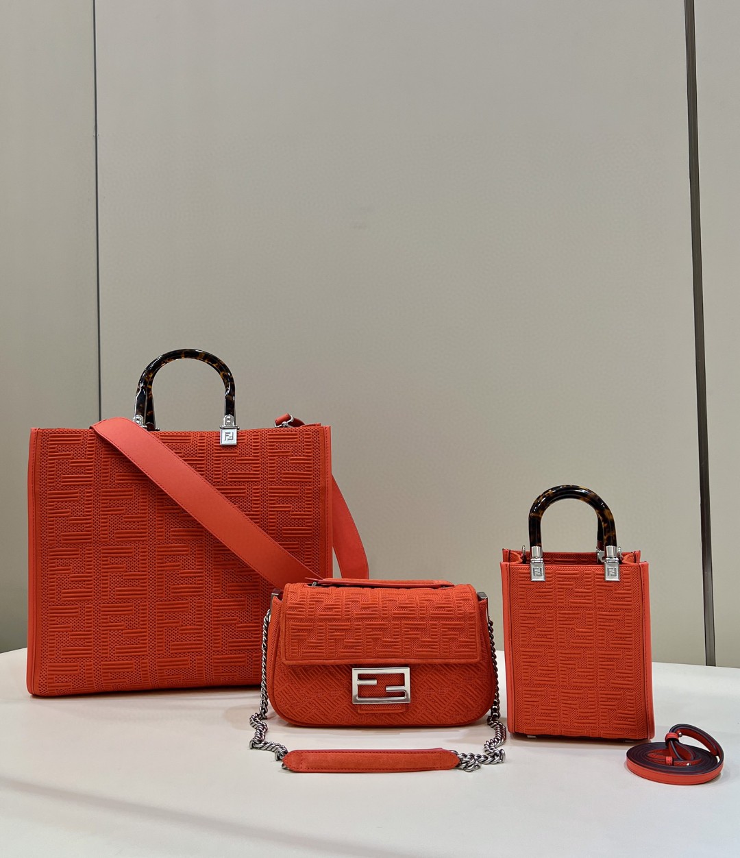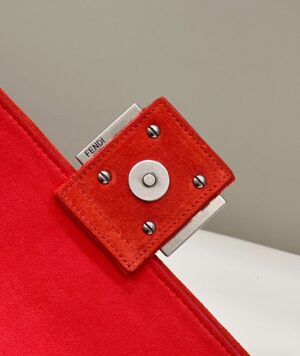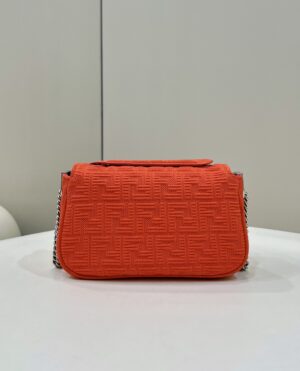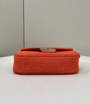 Iconic medium Baguette bag with chain shoulder strap, made of red technical mesh with a 3D texture FF motif. Decorated with an FF clasp.
