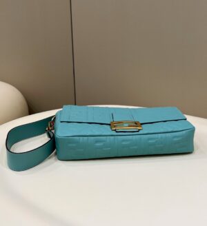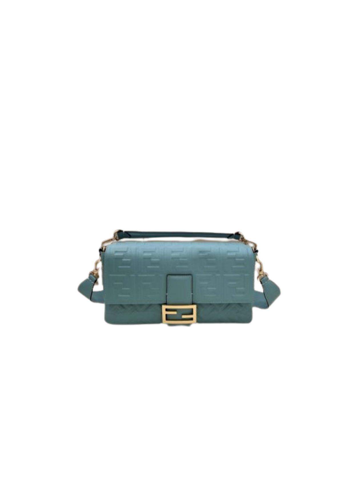 Iconic medium Baguette bag made of soft mint green nappa leather with a three-dimensional textured embossed FF motif. Decorated with an FF clasp.