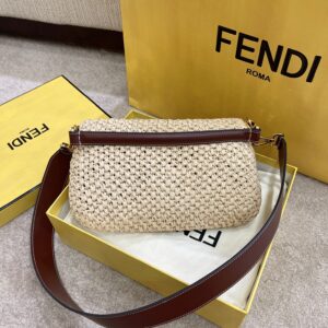 Iconic Baguette bag with flap and FF fastening with magnetic clasp. It can also be worn cross-body thanks to the shoulder strap. Lining with flat pocket. Made of straw woven.