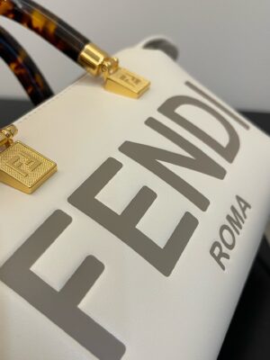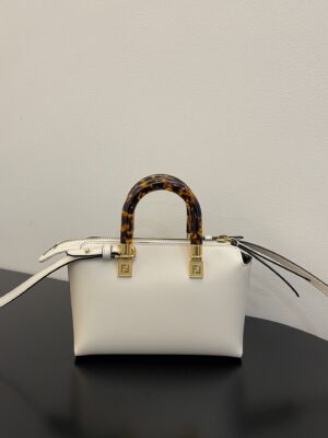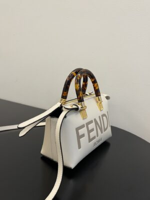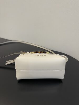 Iconic mini By The Way Boston bag, made of White leather with hot-stamped FENDI ROMA lettering. Zip fastening.