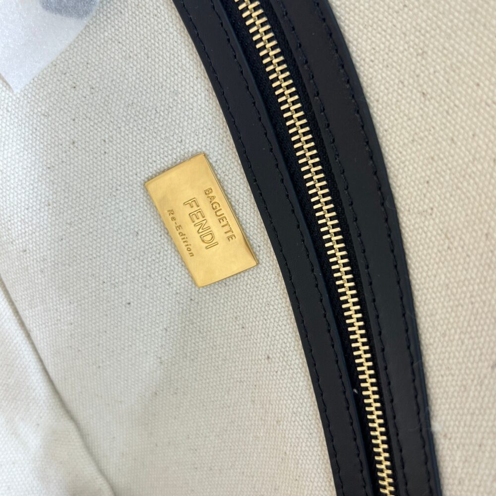 • Iconic medium Baguette bag, made of white canvas with a black FF motif in a raised embroidery and a decorative FF clasp.