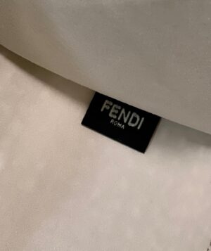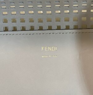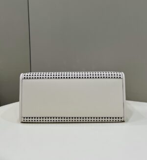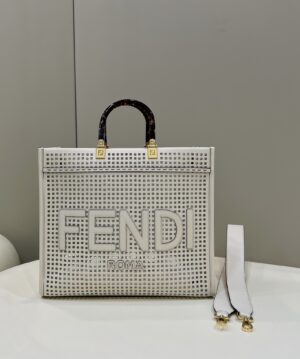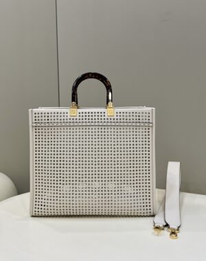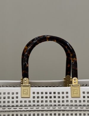 Medium Sunshine shopper made of white leather with laser-cut openwork. Tone on tone leather “FENDI ROMA” lettering and stiff tortoiseshell-effect plexiglass handles.