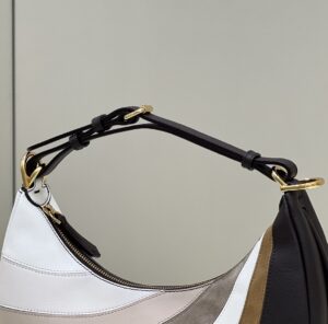 Small Hobo bag produced by inlaying leather, laminated leather and suede by hand to a rainbow diagonal striped motif in shades of beige and brown. With vintage gold metal FENDI lettering visible when the bag is worn under the arm.