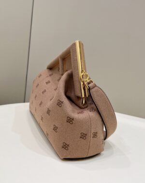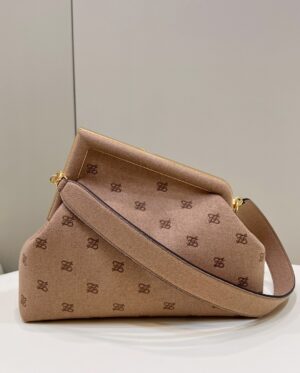 Medium Fendi First bag made of soft, caramel coloured nappa leather, with metal macro F fastening bound in tone on tone nappa leather.