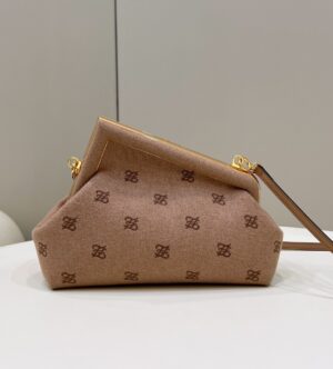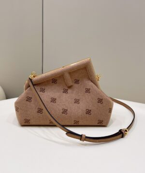 Small Fendi First bag made of soft, caramel coloured nappa leather, with metal macro F fastening bound in tone on tone nappa leather.