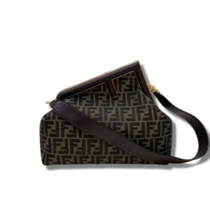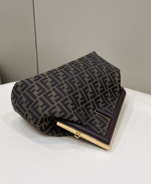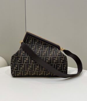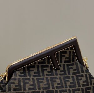 Small Fendi First bag made of soft, brown canvas with oversized metal F clasp wrapped in tone on tone nappa. Can be carried by hand as a clutch or worn on the shoulder thanks to the detachable shoulder strap.