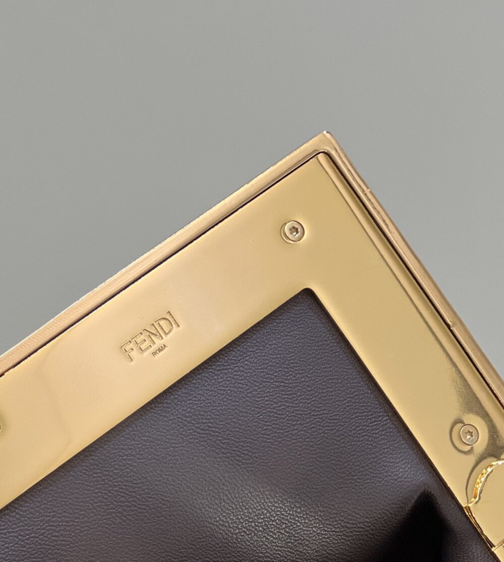 Small Fendi First bag made of soft, brown canvas with oversized metal F clasp wrapped in tone on tone nappa. Can be carried by hand as a clutch or worn on the shoulder thanks to the detachable shoulder strap.