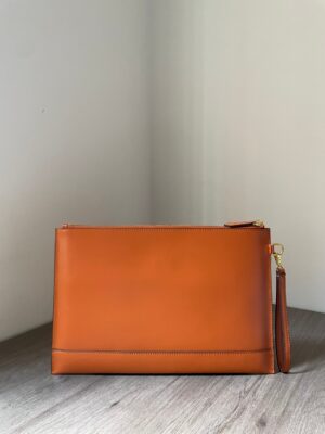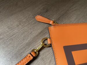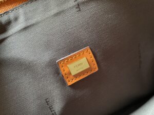 Large pouch with removable bracelet handle. Zip fastening. Made of brown leather with hot-stamped FENDI ROMA motif. Gold-finish metalware.
