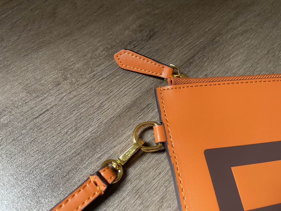 Large pouch with removable bracelet handle. Zip fastening. Made of brown leather with hot-stamped FENDI ROMA motif. Gold-finish metalware.