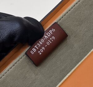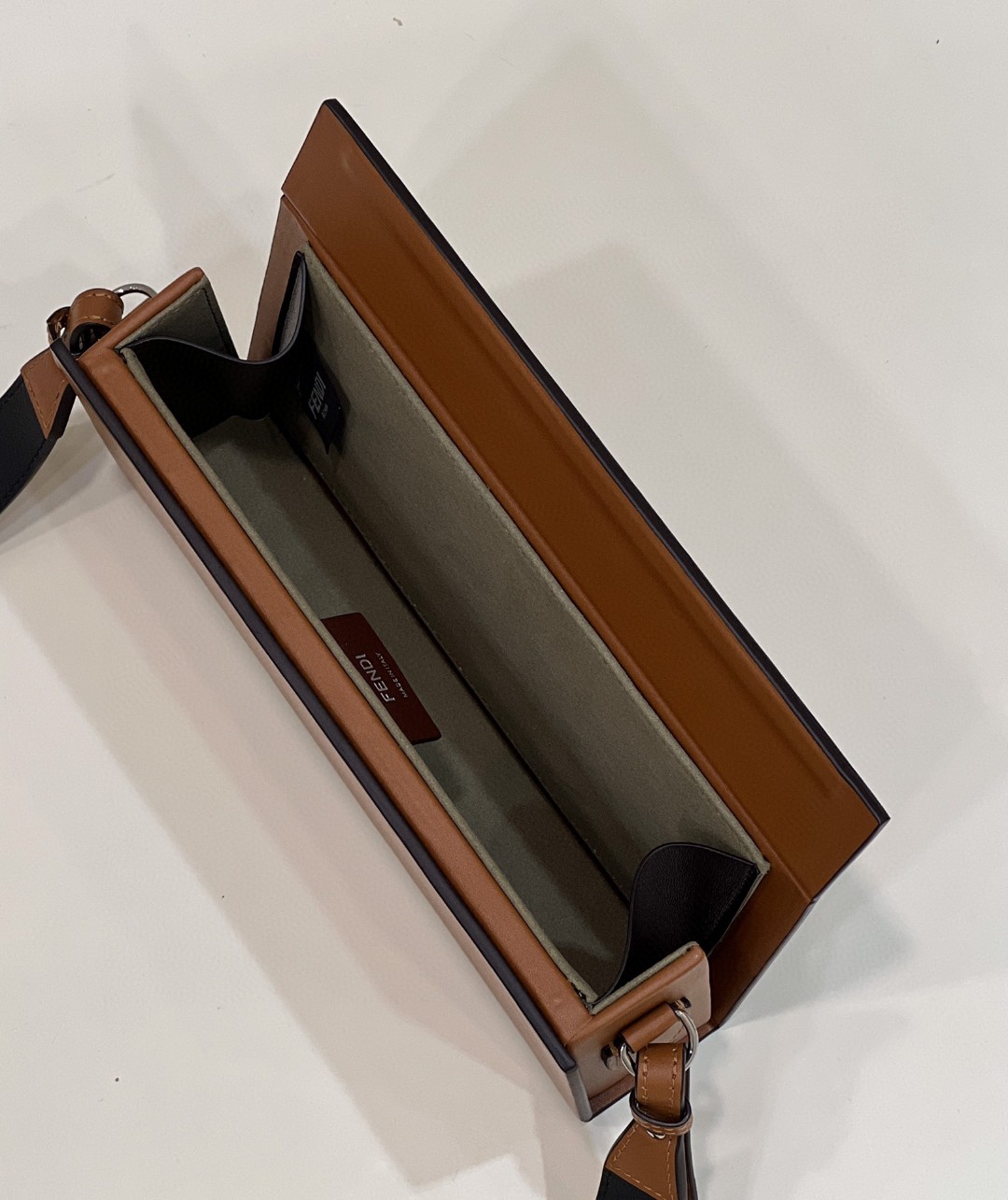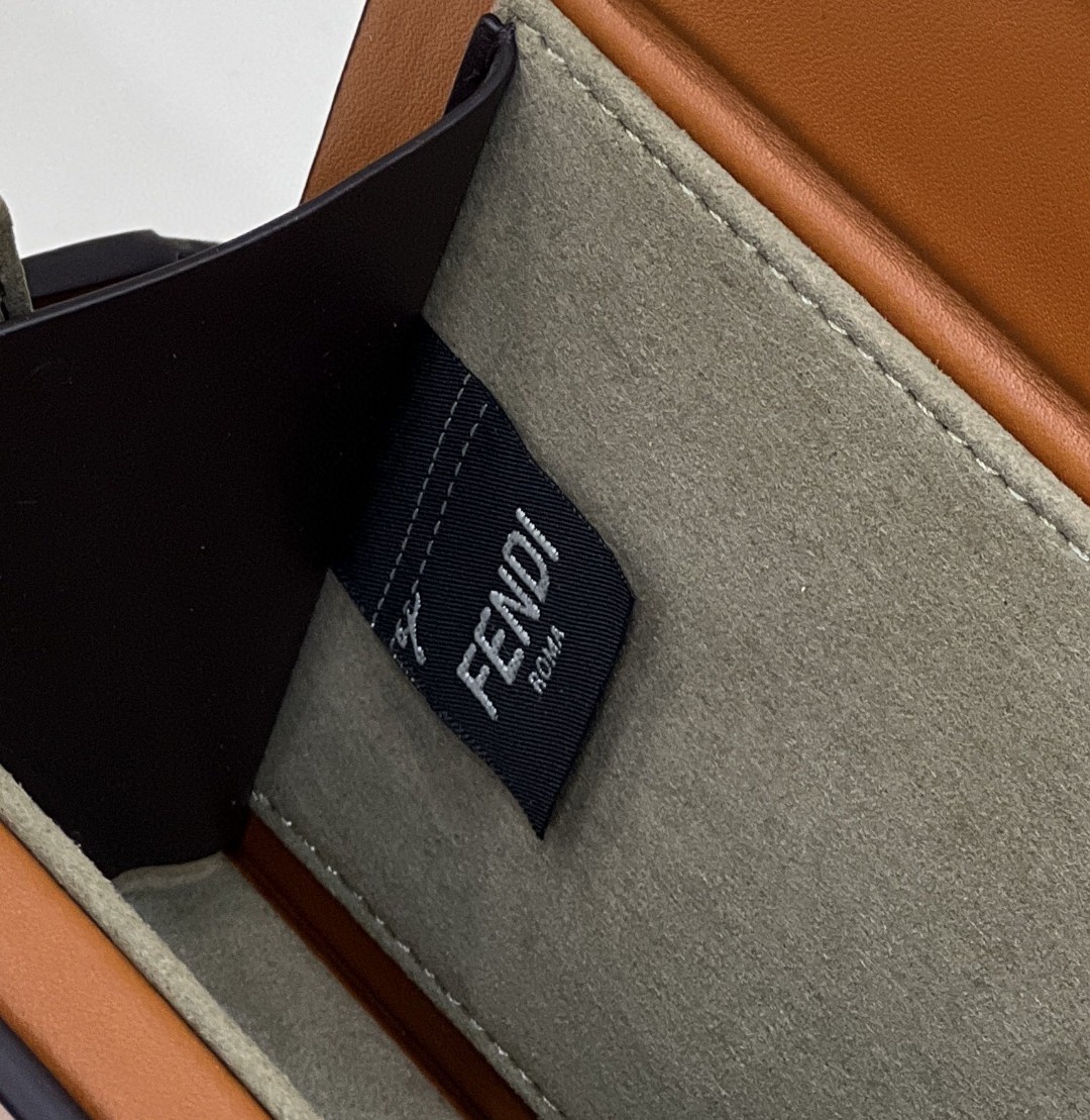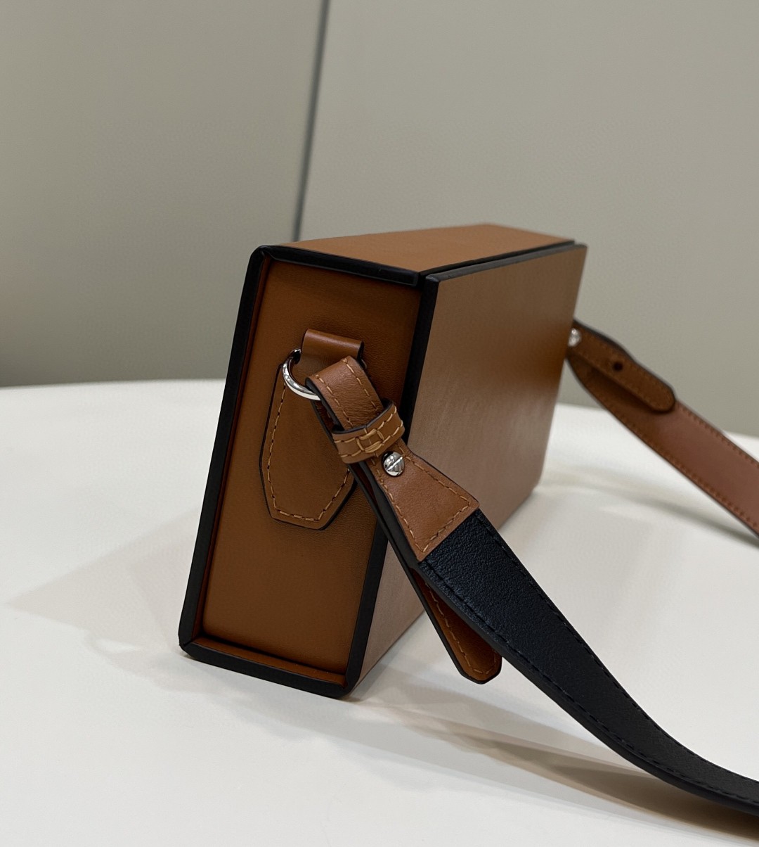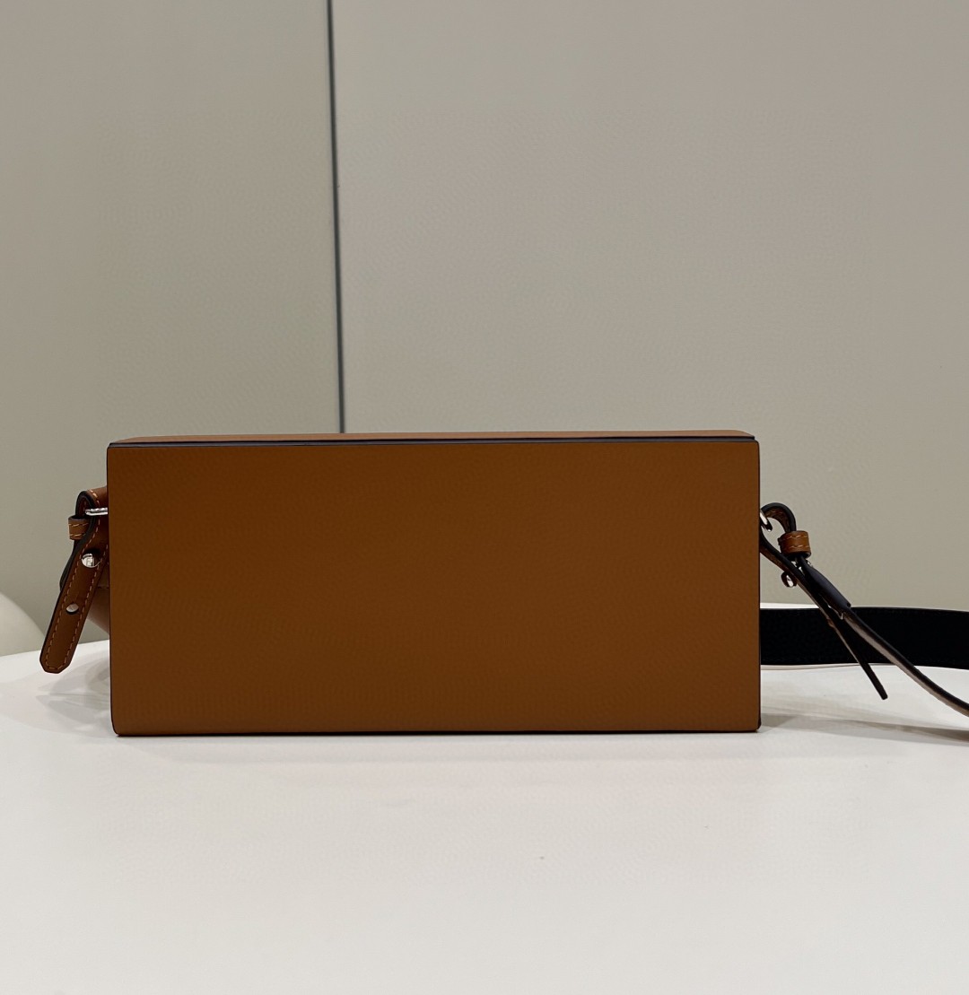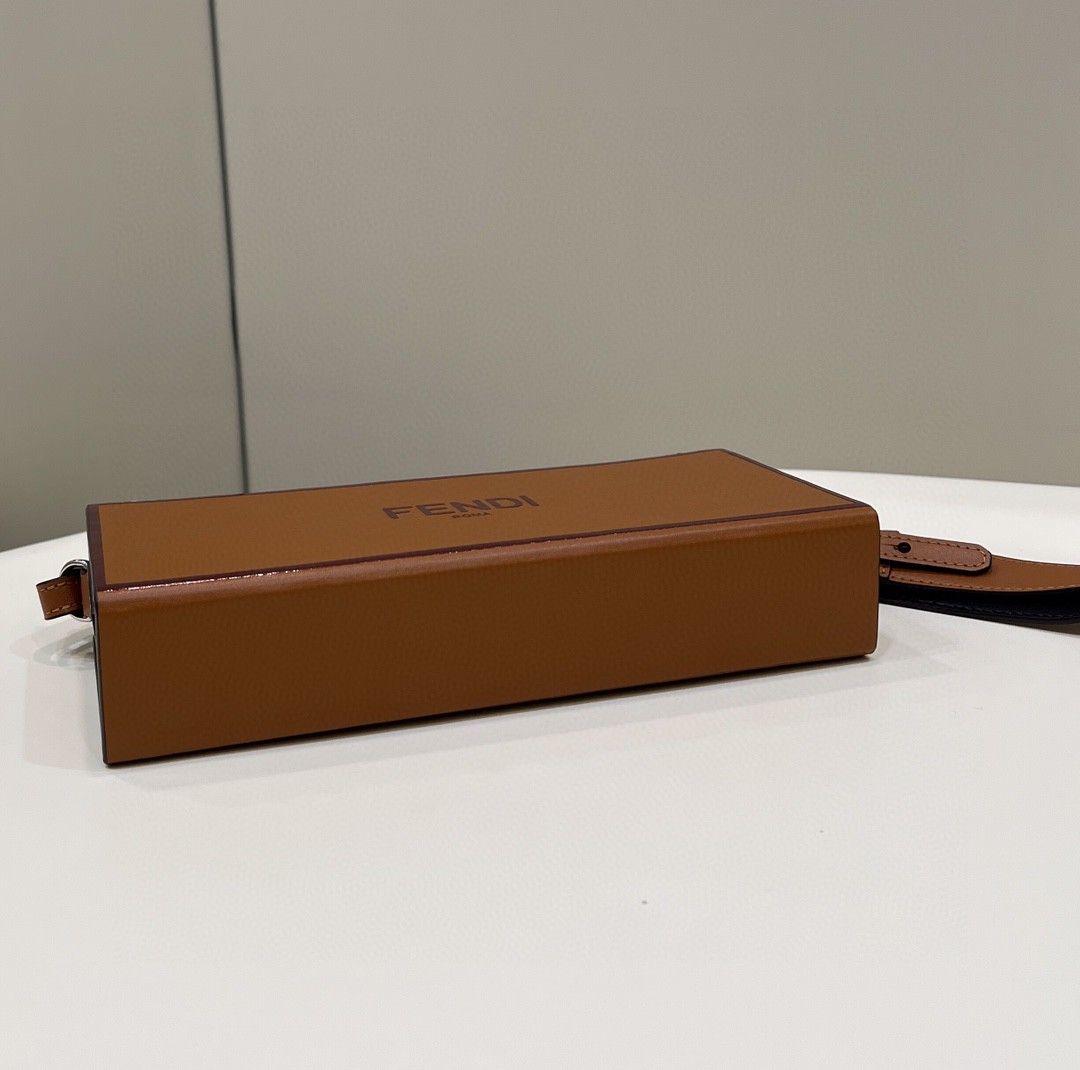 Rigid horizontal bag inspired by the iconic Fendi packaging, with magnetic clasp. The cross-body strap is adjustable and detachable. Made of wood. Covered in brown leather with screen printed parchment effect. Embellished with embossed edges and Fendi Roma lettering hand painted in black. Alcantara® lining. Gold-finish metalware.