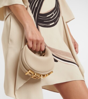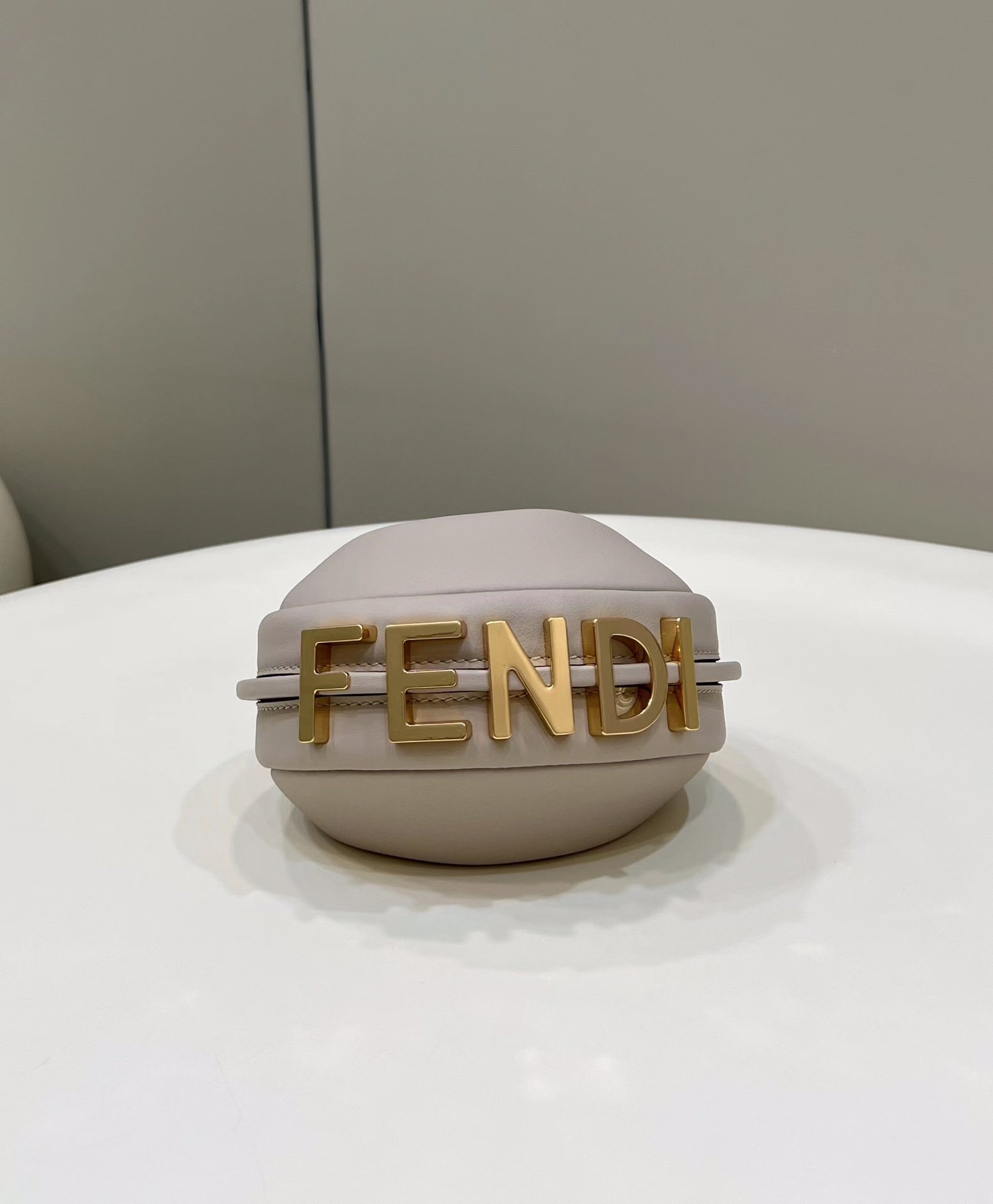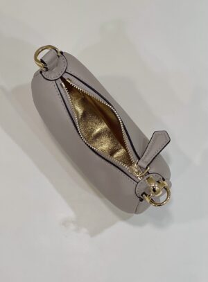 Mini hobo bag made of soft beige leather, decorated with vintage gold metal FENDI lettering visible when wearing the bag under the arm.