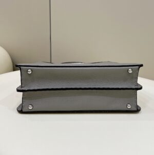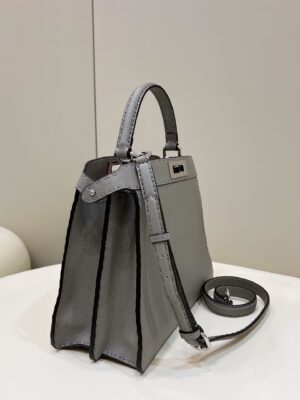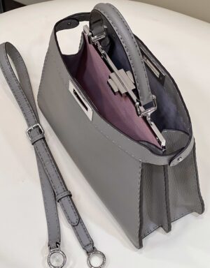 Medium Peekaboo ISeeU bag, made of gray Cuoio Romano topstitched by hand. The interior is organised into two compartments divided by a stiff partition, the front features the iconic twist lock, and there is a zip fastening on the back. The removable interior pocket. Can be carried by hand or on the shoulder thanks to the handle and adjustable, detachable shoulder strap.