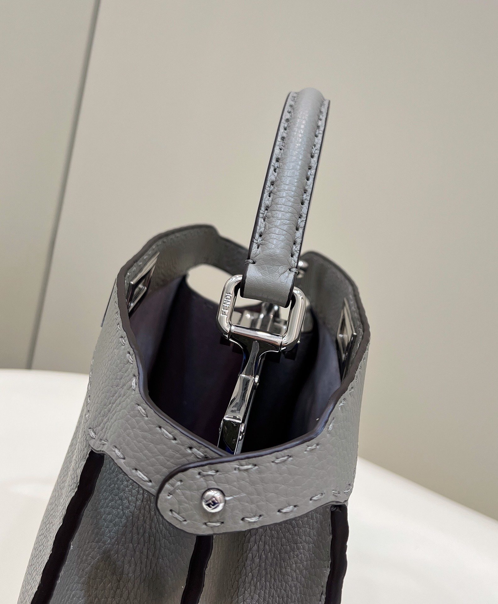 Medium Peekaboo ISeeU bag, made of gray Cuoio Romano topstitched by hand. The interior is organised into two compartments divided by a stiff partition, the front features the iconic twist lock, and there is a zip fastening on the back. The removable interior pocket. Can be carried by hand or on the shoulder thanks to the handle and adjustable, detachable shoulder strap.