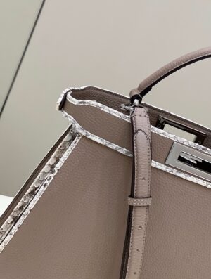 Medium Peekaboo ISeeU bag, made of greige Cuoio Romano topstitched by hand. The interior is organised into two compartments divided by a stiff partition, the front features the iconic twist lock, and there is a zip fastening on the back. The removable interior pocket. Can be carried by hand or on the shoulder thanks to the handle and adjustable, detachable shoulder strap.