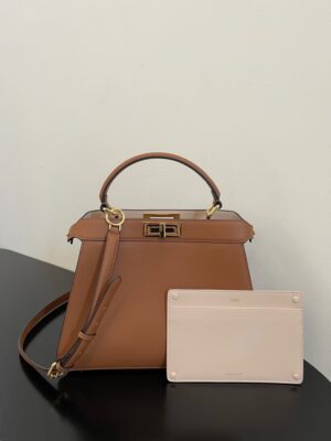 Iconic Peekaboo ISeeU bag in an ideal, compact size. Made from soft, padded, Brown nappa leather and embellished with the classic twist lock on both sides.