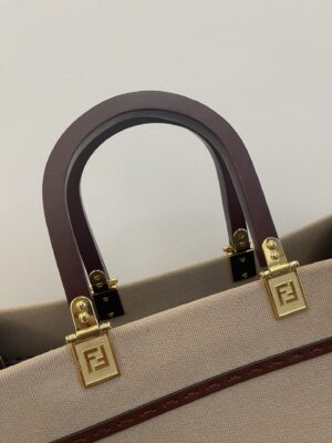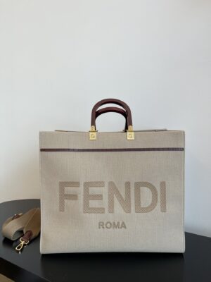Fendi Large Sunshine shopper made of beige canvas, featuring tone on tone embossed “FENDI ROMA” embroidery and stiff handles. Can be carried by hand or worn on the shoulder thanks to the two handles and detachable canvas shoulder strap.