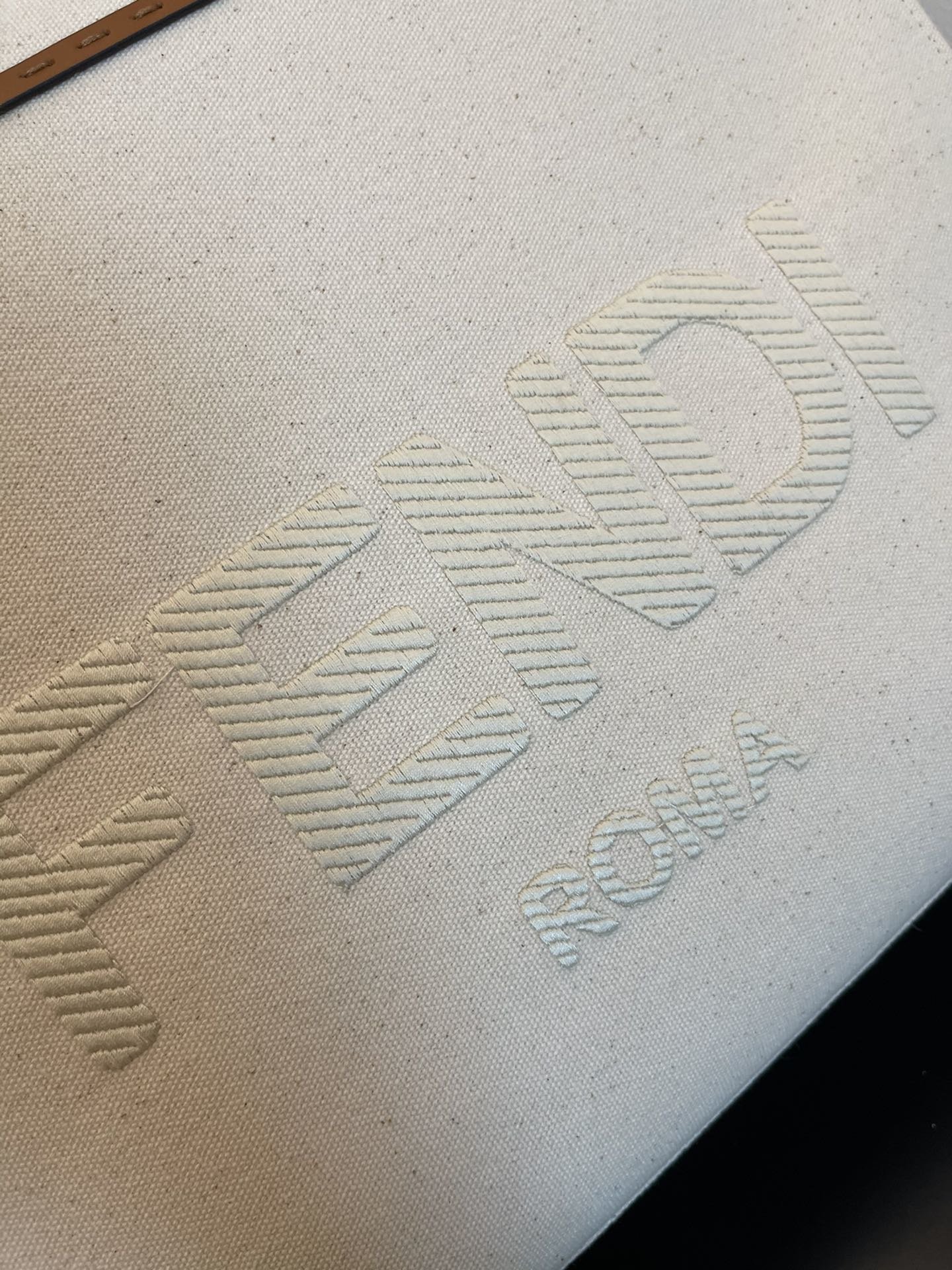 Fendi Medium Sunshine shopper made of Light Grey canvas, featuring tone on tone embossed “FENDI ROMA” embroidery and stiff handles. Can be carried by hand or worn on the shoulder thanks to the two handles and detachable canvas shoulder strap.
