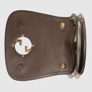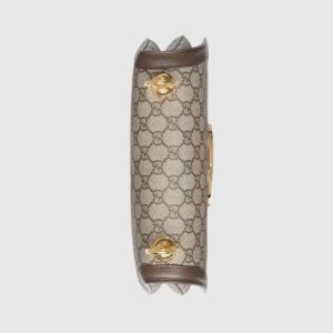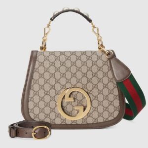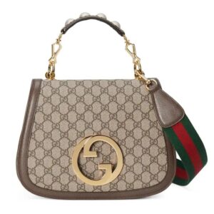 Coming from the House’s archives, a geometrically shaped version of the Interlocking G logo comes to the fore. The gold-toned hardware adds a defined vintage feel to the style, enriching the design with a timeless feel—mirroring the Hollywood glamour that shaped the fashion show. The GG Supreme canvas top handle bag is completed by two interchangeable straps.