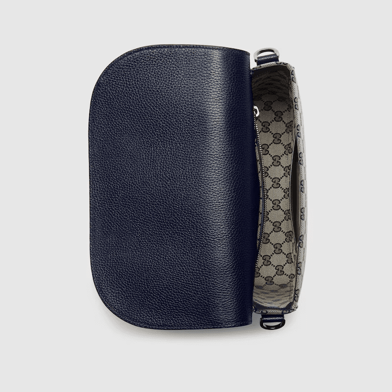 A selection of men’s bags, including cross-body bags, briefcases and totes have been reshaped with functional details. Featuring a light construction in a beige and blue colour palette, the GG motif defines each style made from the signature Original GG canvas. A dark blue leather trim completes this cross-body bag, complete with one zip pocket and flat pocket.