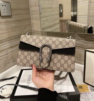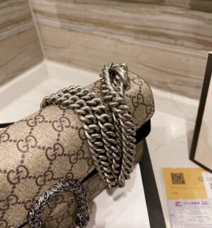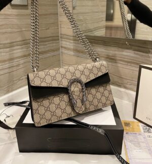 A structured GG Supreme canvas bag with our textured tiger head closure-a unique detail referencing the Greek god Dionysus, who in myth is said to have crossed the river Tigris on a tiger sent to him by Zeus. The sliding chain strap can be worn multiple ways, changing between a shoulder and a top handle bag.