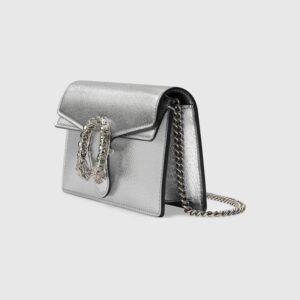 The structured super mini bag is introduced in metallic silver leather, with a key ring that can be used to attach the bag to a separate larger bag. The closure features the textured tiger head spur—the unique detail defines the line, referencing the Greek god Dionysus, who in myth is said to have crossed the river Tigris on a tiger sent to him by Zeus.