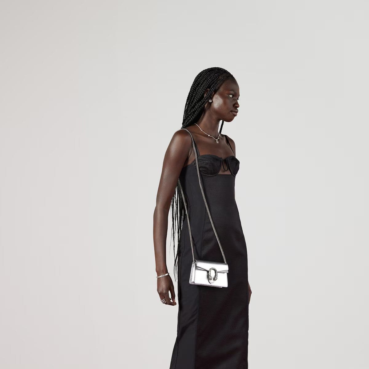 The structured super mini bag is introduced in metallic silver leather, with a key ring that can be used to attach the bag to a separate larger bag. The closure features the textured tiger head spur—the unique detail defines the line, referencing the Greek god Dionysus, who in myth is said to have crossed the river Tigris on a tiger sent to him by Zeus.
