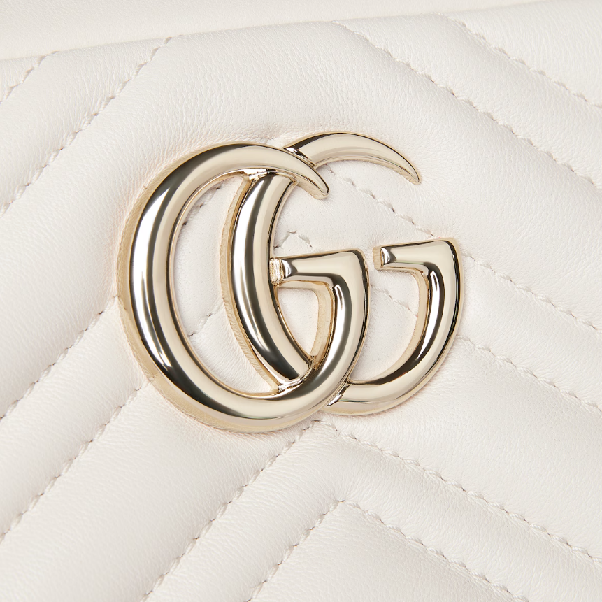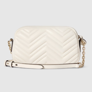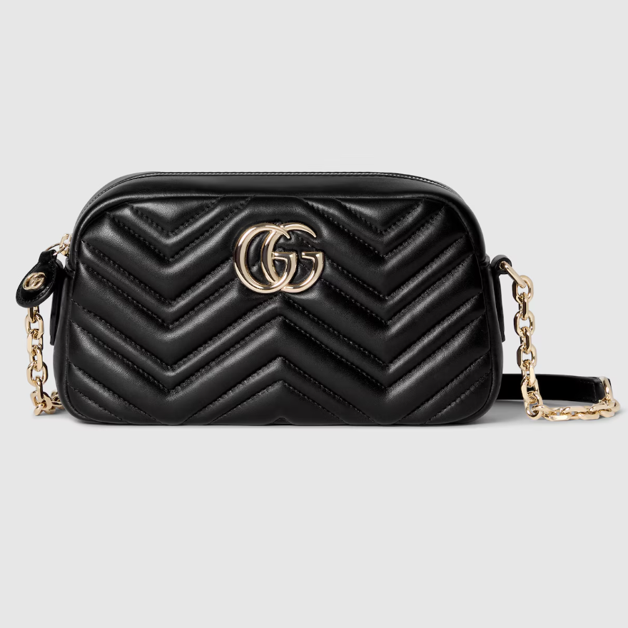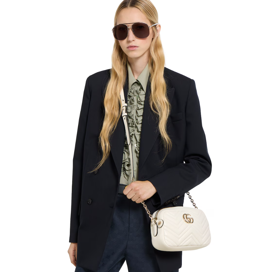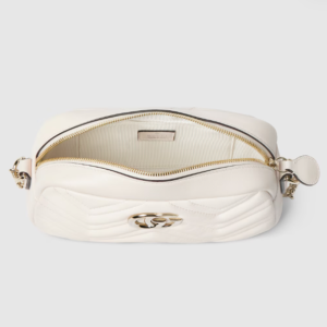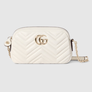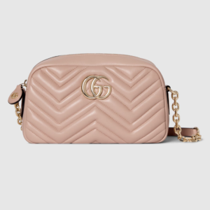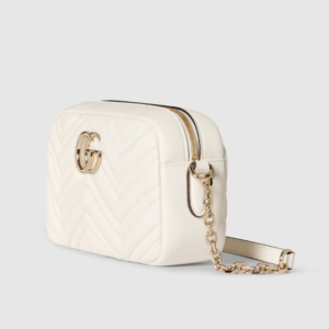 The GG Marmont, a signature collection of the House, features the emblematic Double G, a faceted chain strap, and contemporary silhouettes. The new camera bag highlights fine craftsmanship with exceptionally supple leather and intricate hardware details in light gold-toned finish.